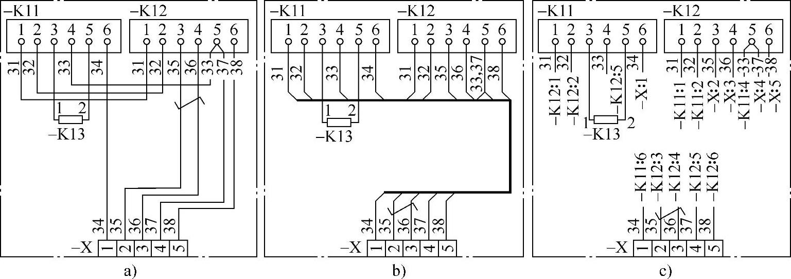 单元内部的连接关系也可用单元接线表来表示。表2-7就是根据图2-10所示的单元接线图列出的单元接线表,它是按照连接线号顺序排列的。该表共有十根连接线。其中—K11和—K13之间的两根连接线很短,没有编号,其余的八根连接线采用独立标记法进行编号,按顺序编为31~38。项目—K12的第五个端子同时连接线号为“33”和“37”的连接线。线号为33的连接线的“参考”栏内标有数字“37”,其含义为可参考线号为37的连接线。由线号为33和37的两根连接线所连接的端子,是一个共同的接线端子,即—K12的第五号端子。