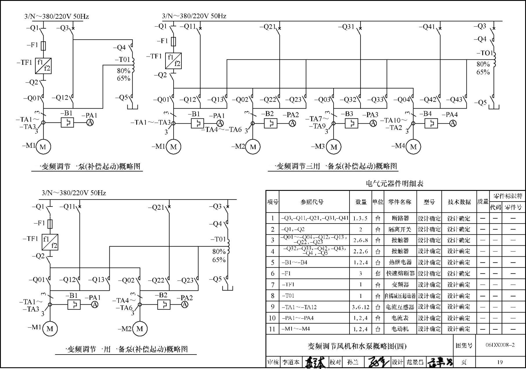 综上所述,概略图对布图有较高的要求,强调布局清晰,有利于识别过程和信息的流向。基本流向应是自左至右或自上至下,只有在某些特殊情况下可例外。用于表达非电过程中的电气控制系统或电气控制设备的概略图,可以根据非电过程的流程图绘制。但一般要求控制信号流向应与过程流向垂直绘制,以利于识别。图2-19所示为某工程变频调节风机和水泵概略图应用实例。