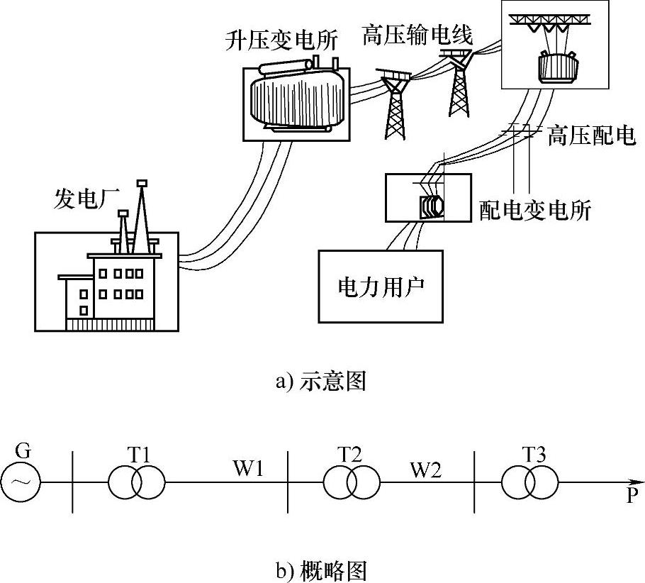 用一般符号绘制的概略图通常采用单线表示法绘制。图2-15a所示为电力供电系统示意图,清楚地表达了电力供电系统中发电、输电和配电的全过程。若分别用图形符号代表发电机(G)、变压器(T)、线路(W)、负荷(P),并标注一定的文字符号,就可以把图2-15a绘制成为图2-15b所示的概略图。