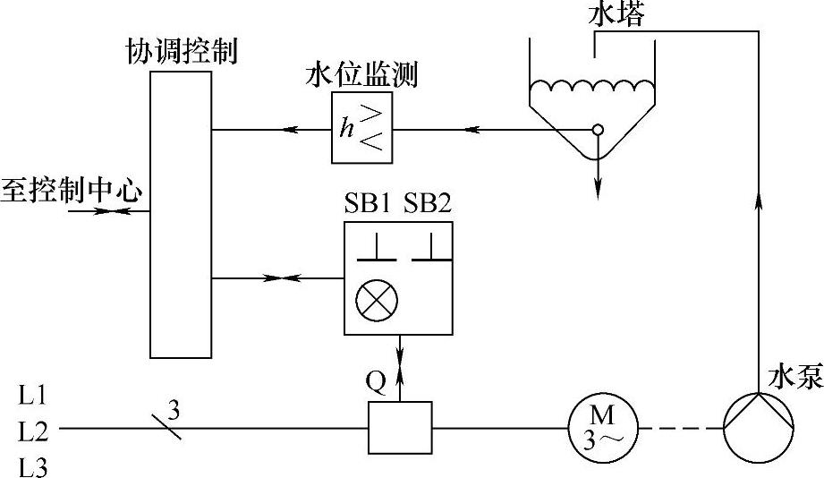 在某些情况下与非电流程统一绘制的概略图能更清楚地表示系统的构成和特征。图2-18所示为某一水泵电动机供电和给水系统的概略图。它表示了电动机供电、水泵工作和控制三个部分间的连接关系。
