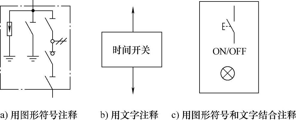 框图的常用注释方法如图2-17所示,其中,图2-17a所示为通用的图形符号注释,较详细地表示了框内各主要元器件的连接关系:电源输入,经隔离开关、电流互感器、负荷开关、隔离开关至输出,一组避雷器和一组接地隔离开关并联,一端接电源,一端接地。图2-17b采用文字注释,用文字直接说明该框的功能是作为时间开关用的。图2-17c将上述两种方法综合运用,即采用符号与文字相结合的注释法,识读时更容易理解。