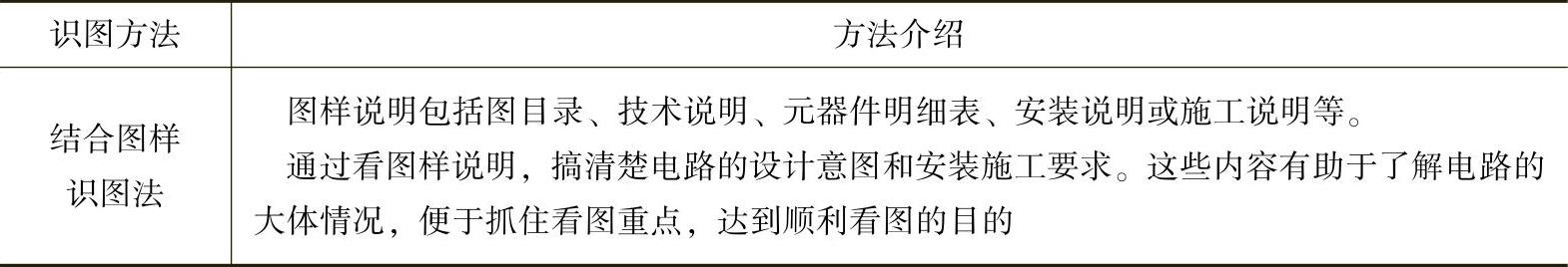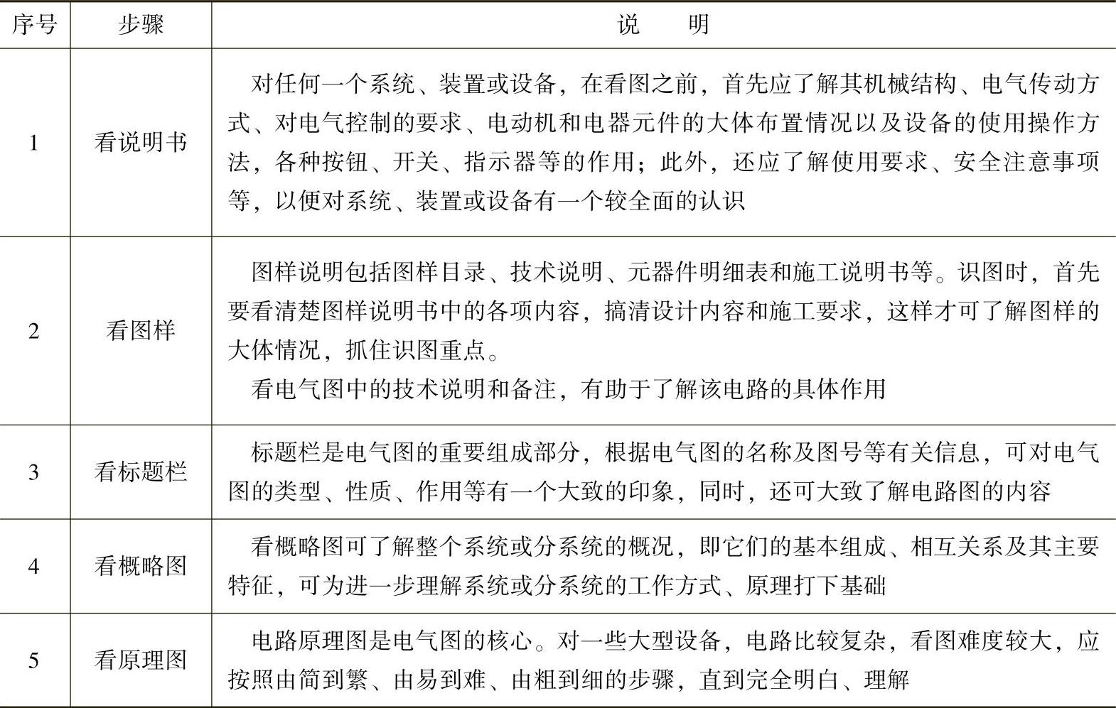 对于比较复杂的电气图,可按照看说明书、看图样说明、看标题栏、看概略图和看电路图的“五看”步骤来识读,见表3-2。