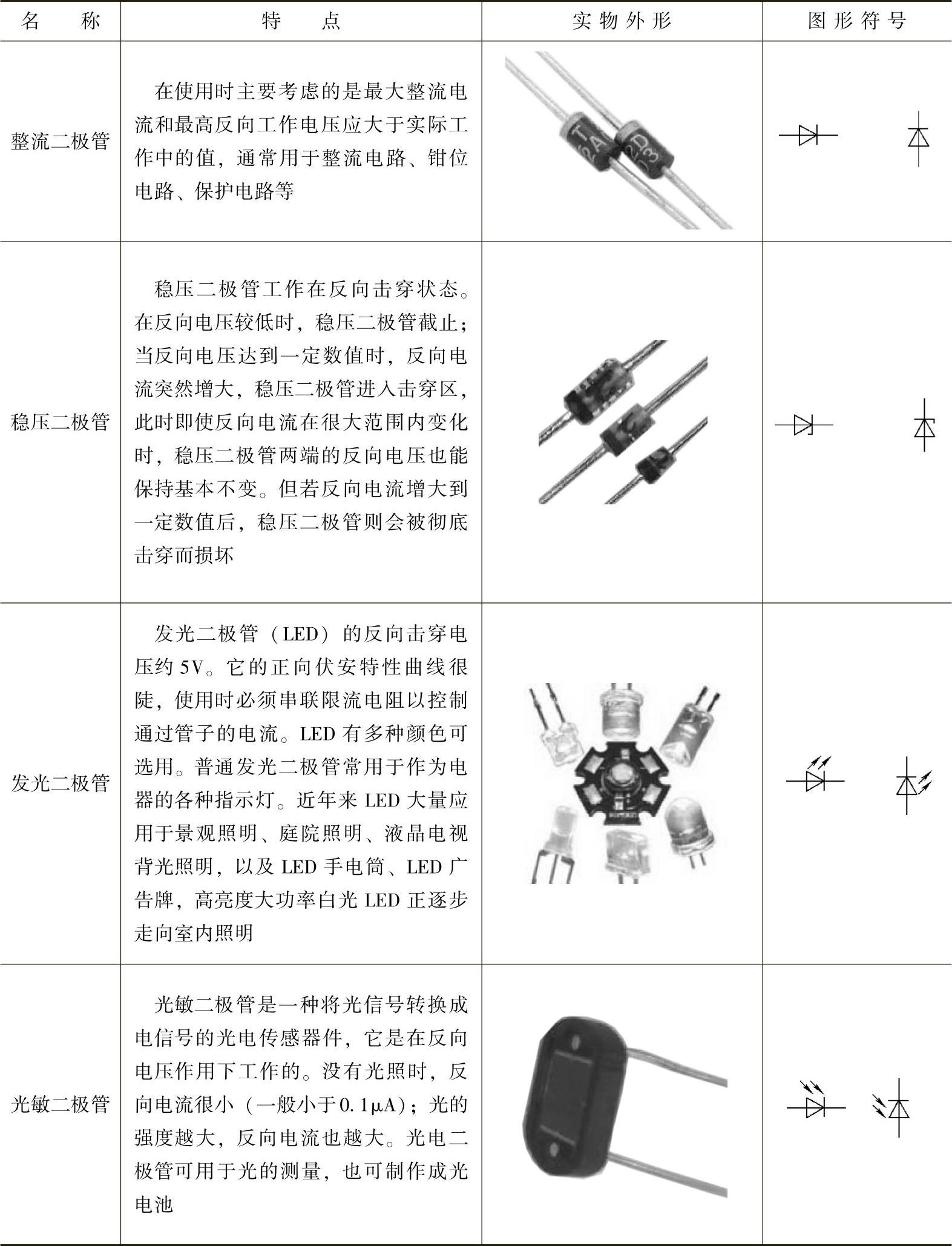 二极管的大家族中有许多特殊的成员,它们活跃在电子电工的各个领域。常用二极管的特点见表2-8。