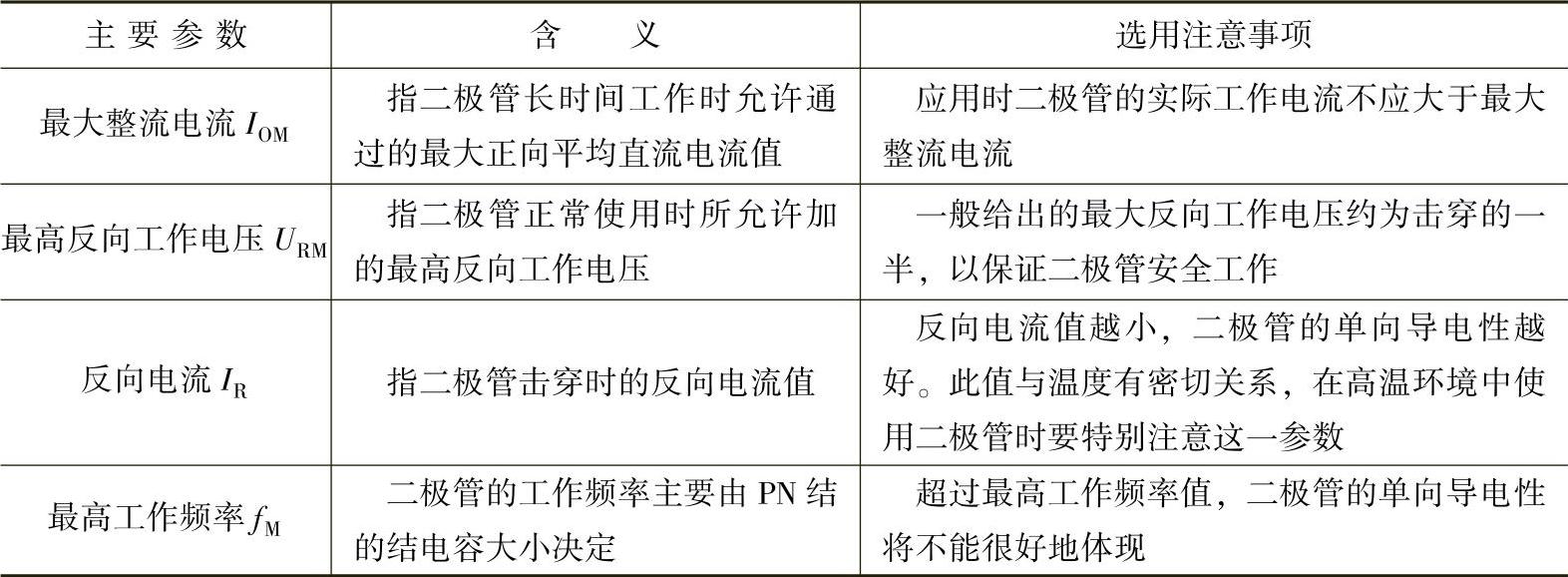 表2-7 二极管的主要参数及选用注意事项