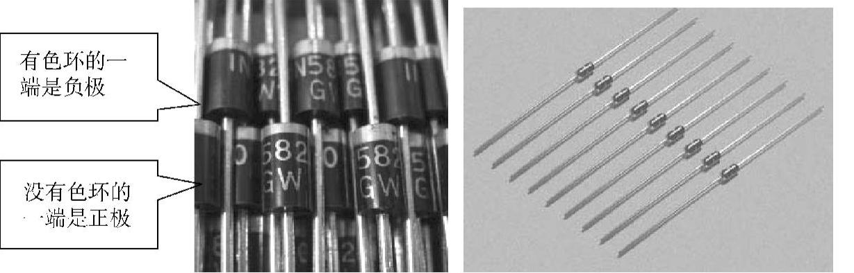 二极管是半导体二极管的简称,在电子产品中常用来整流、检波和开关、稳压等。普通二极管一般为圆柱形,其封装外壳有塑料、玻璃和金属。常见二极管的外形如图2-24所示。