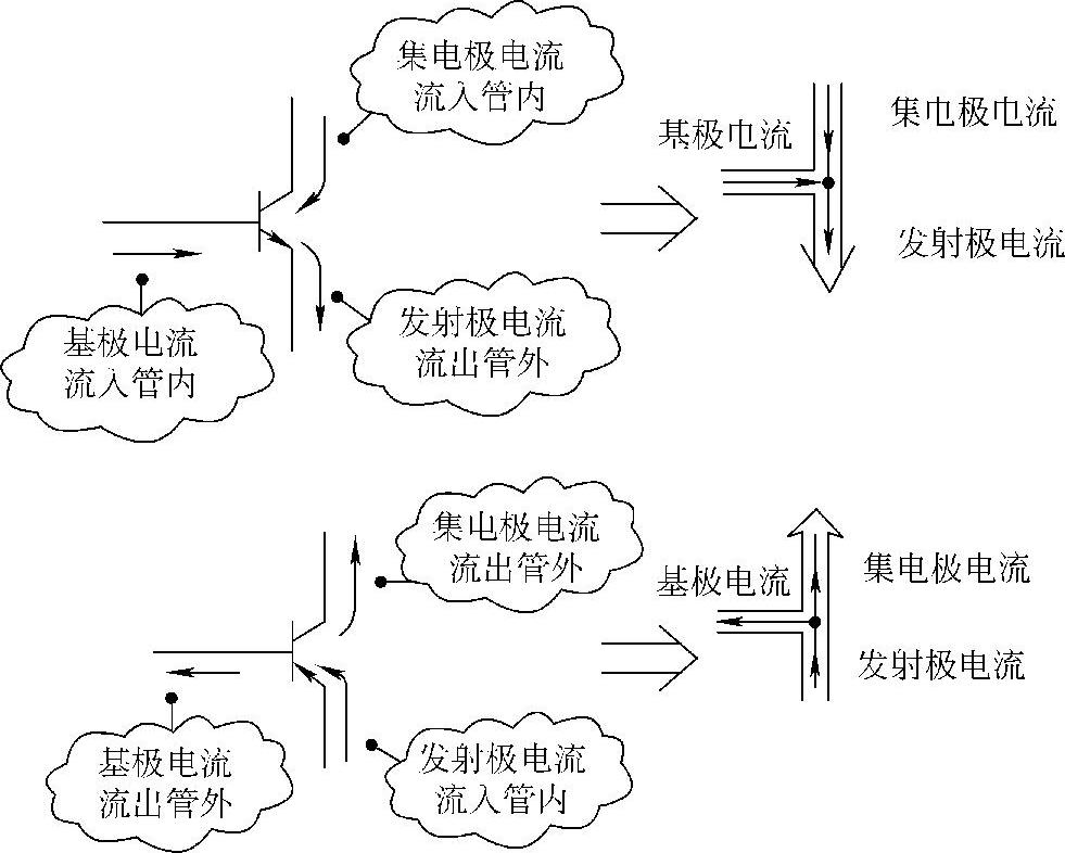 在晶体管的符号中,发射极上标的箭头代表其电流方向。晶体管的电流流向是确定的,但不同极性的晶体管不同,如图2-27所示。