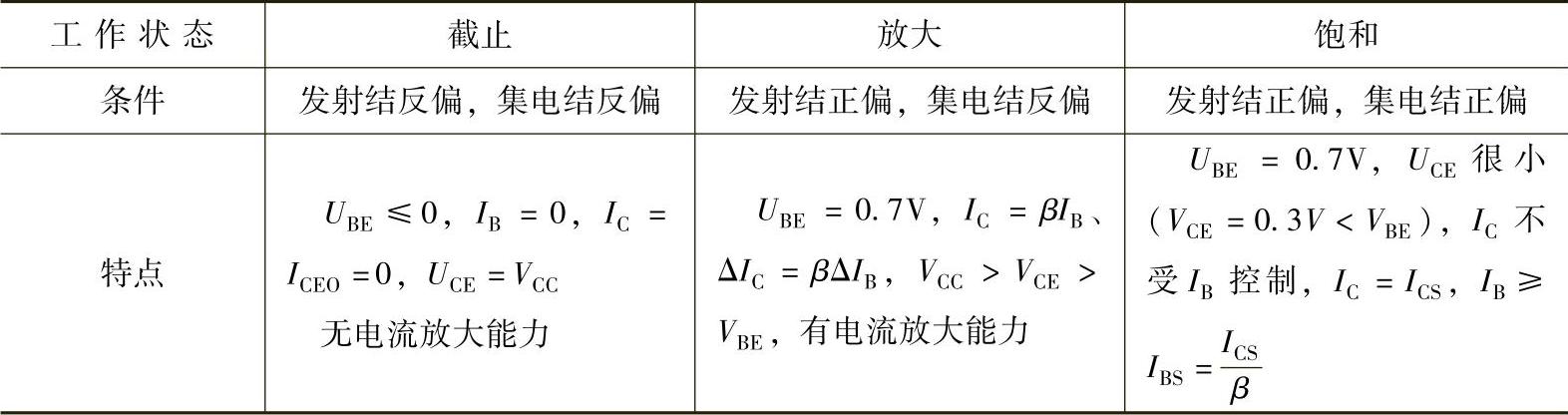 根据晶体管工作状态可分为放大、截止、饱和。以NPN型晶体管为例,其在不同工作状态下的特点见表2-9。