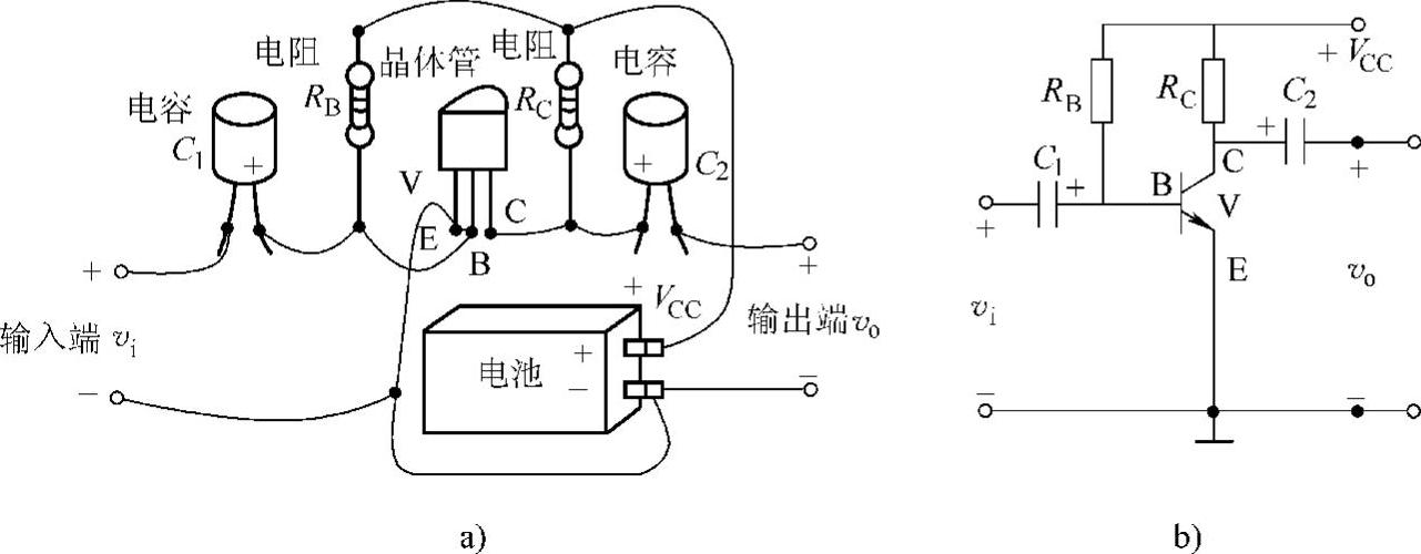 晶体管共发射极基本放大电路如图2-29所示。其信号从基极和射极之间输入,放大后由集电极和发射极之间输出。发射极是输入输出信号的公共端,所以该电路为共发射极放大电路。