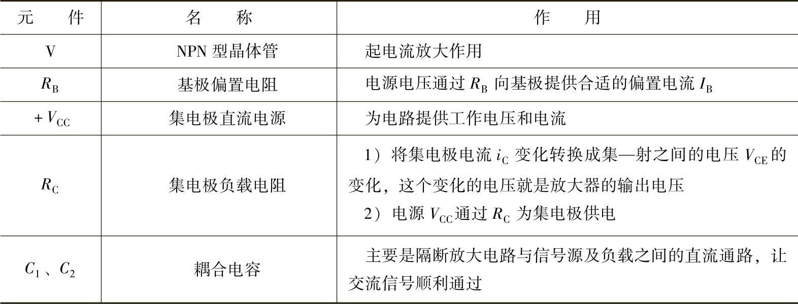 图2-29的基本放大电路各个元器件名称及作用见表2-11。