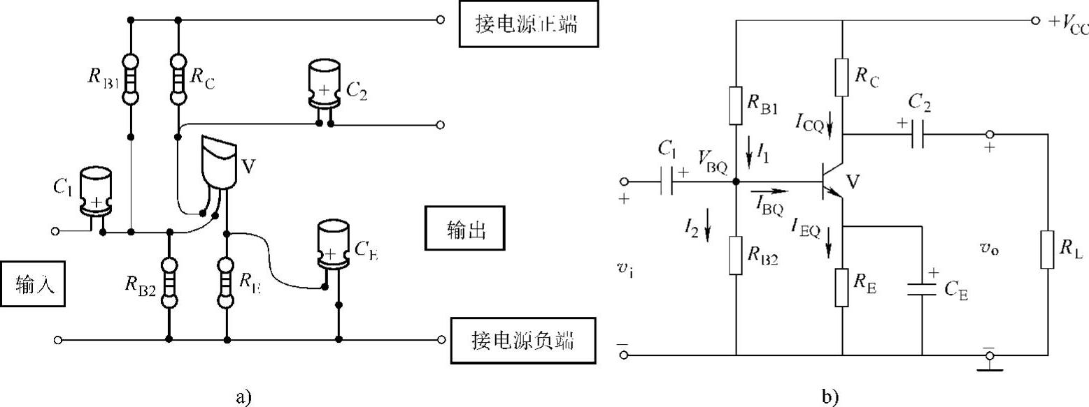如图2-30所示,在基极用分压电路 R B1 和 R B2 作偏置电阻,提供基极直流电压和电流;采用偏置电阻 R B1 、 R B2 对电源分压,固定基极直流电压 V B 。