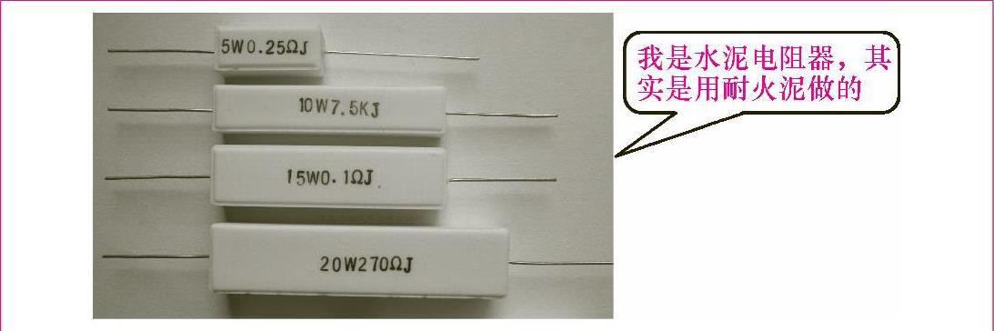 水泥电阻器通常用于功率大、电流大的场合,有2W、3W、5W、10W甚至更大的功率,水泥电阻器具有体积小、耐振、耐湿、耐热及良好散热、低价格等特性,广泛应用于电源适配器、音响设备、音响分频器、仪器、仪表等设备中。