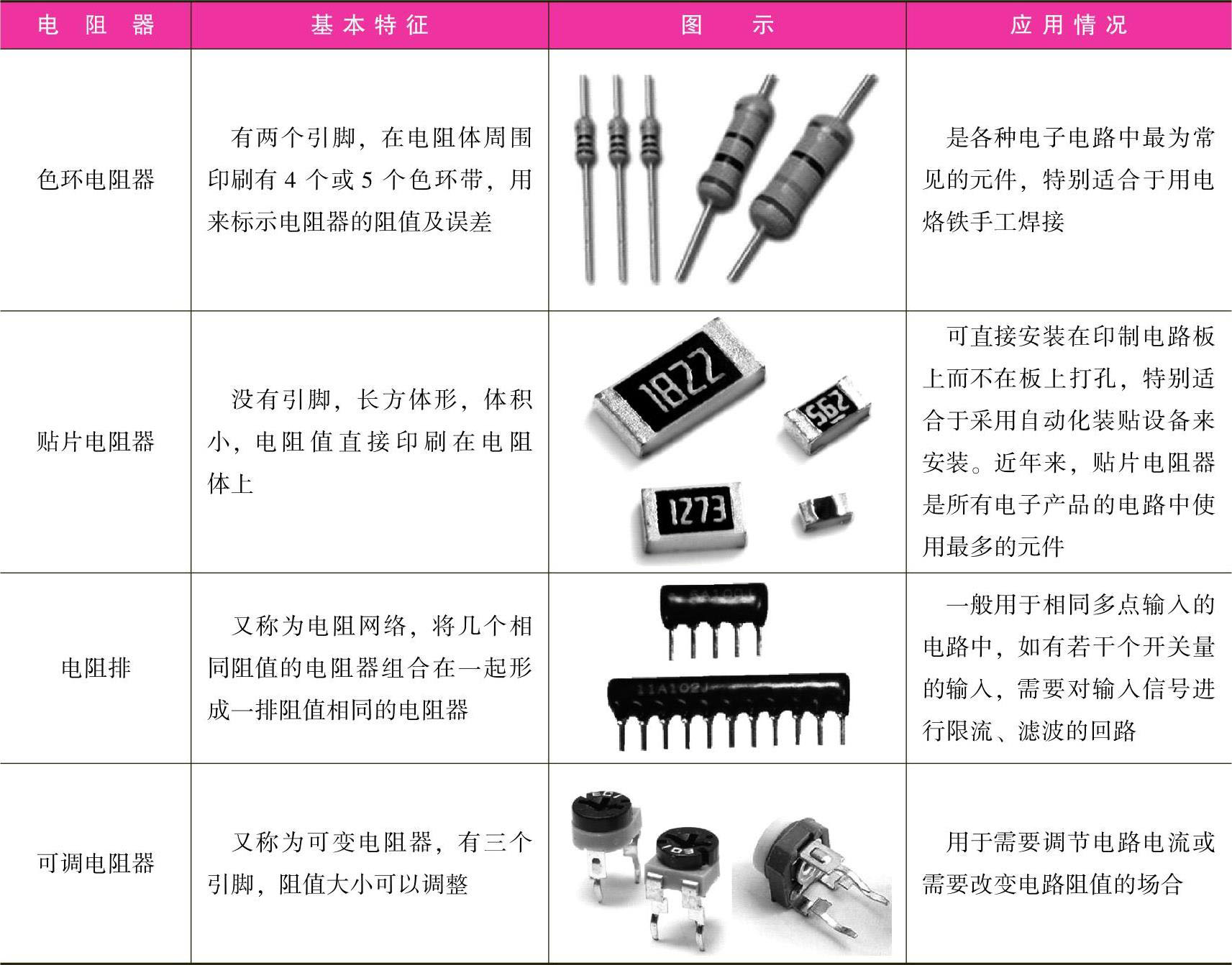 常用电阻器的基本特征及应用见表1-2。