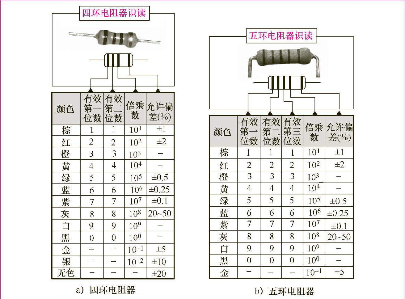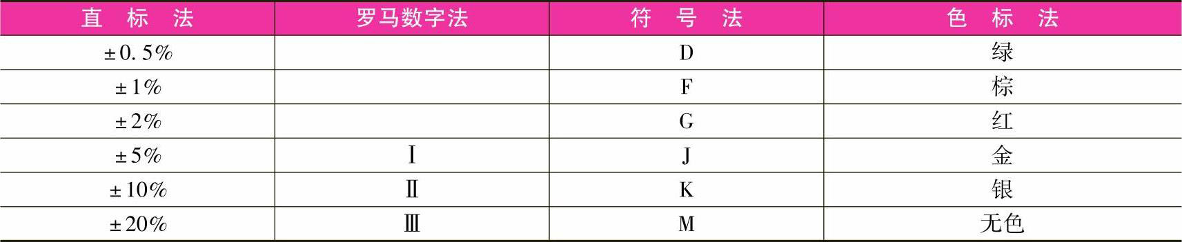 表示允许偏差的方法有直标法、罗马数字法、符号法和色标法,见表1-3。允许偏差值越小,表示电阻器的阻值精度越高。