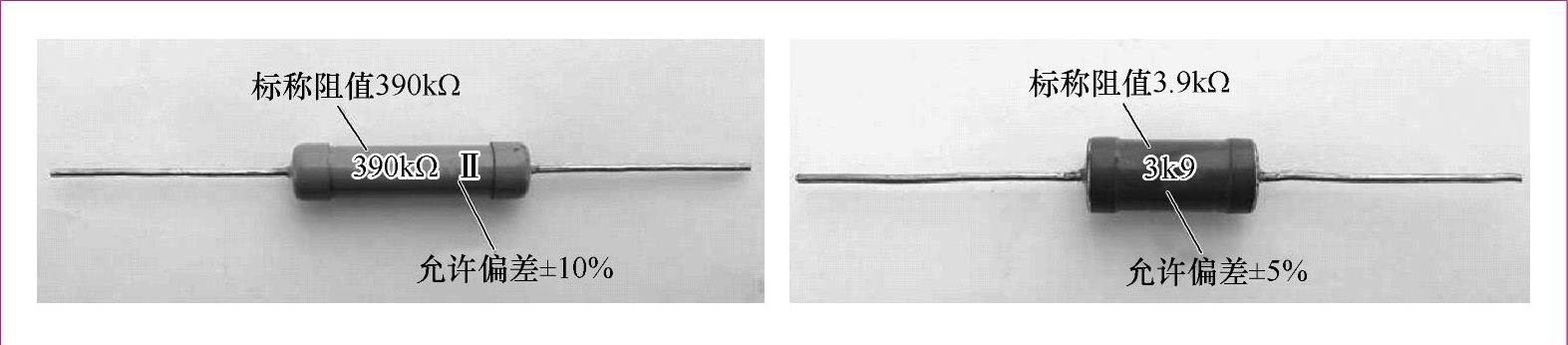 直标法是指将电阻器的类别、标称电阻值、允许偏差、额定功率及其他参数的数值等直接标注在电阻器的表面。也有的用数字加字母符号(Q、Ω、k、M)或两者有规律的组合来表示电阻器的阻值,其中字母符号前面的数字表示阻值的整数部分,字母符号后面的数字表示阻值的小数部分。如“6Ω8”,表示阻值为6.8Ω;“3k9”,表示阻值为3.9kΩ,如图1-5所示。