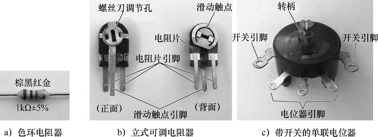 常用的电阻器有普通电阻器和可调电阻器,如图1-2所示。图中,普通色环电阻上的色环用来表示标称阻值大小和阻值的误差。立式可调电阻器共有三个引脚,其中一个为动片引脚,另外两个为定片引脚(两定片引脚不分),它的标称阻值大小直接标注在可变电阻器上,使阻值识别大为方便。带开关的单联电位器有一个操纵柄(转柄),五个引脚,其中两个开关引脚,两个定片引脚,一个动片引脚。