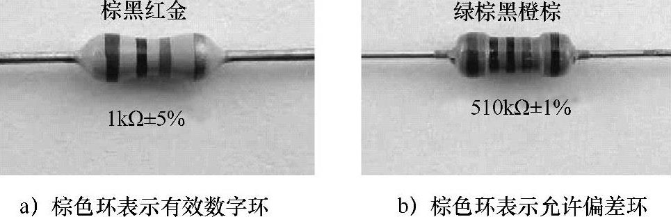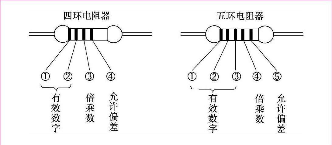 用色标法的电阻器,在电阻器上印有四道或五道色环表示阻值,阻值的单位为Ω。对于四环电阻器,紧靠电阻器端部的第一、二环表示两位有效数字,第三环表示倍乘数,第四环表示允许偏差。对于五环电阻器,第一、二、三环表示三位有效数字,第四环表示倍乘数,第五环表示允许偏差。色环电阻器的标注法如图1-7所示。