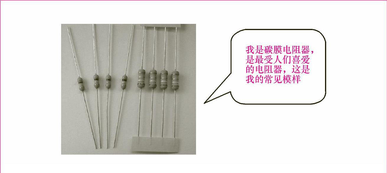 碳膜电阻器,顾名思义它是采用高温真空镀膜技术将碳紧密附在瓷棒表面形成碳膜,然后加适当接头切割,并在其表面涂上环氧树脂密封保护而形成的,常见的碳膜电阻器的外形如图1-10所示。