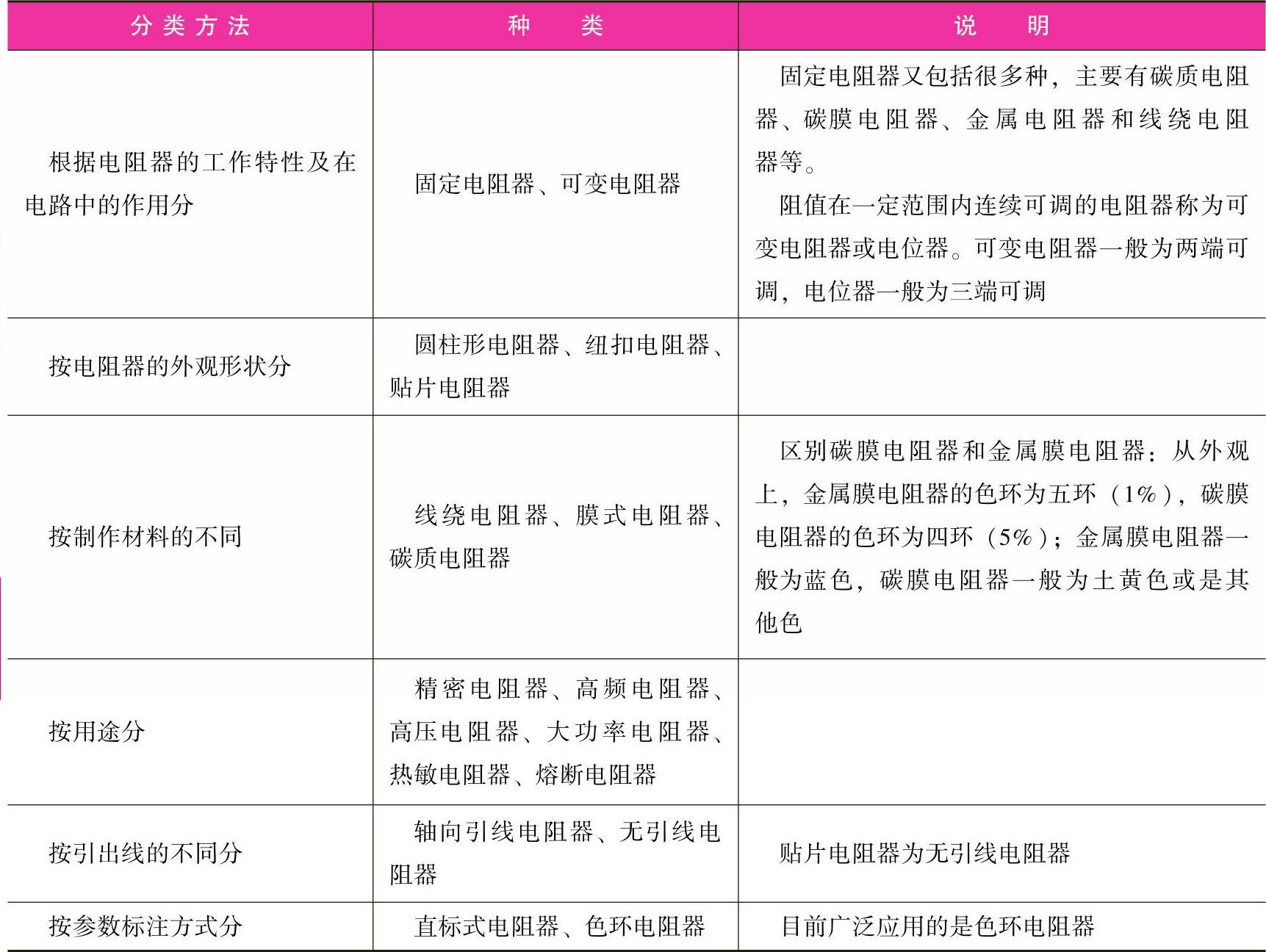 电阻器的种类较多,电阻器不同的分类见表1-1。