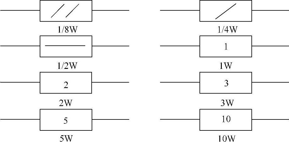 电阻器的额定功率是指在一定的环境温度下,电阻器能够长期连续工作而不改变其性能所允许的最大功率。功率用 P 表示,单位为瓦特(W)。不同类型的电阻器有不同的额定功率,最常用的有1/16W、1/8W、1/4W、1/2W、1W、2W、5W、10W等多种规格,如图1-4所示。
