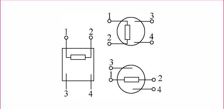万用表两表笔分别任意接触两个引脚测量其电阻值,一般电阻值为30~40Ω的两个引脚为加热器电极,余下的两个引脚为电阻值电极。