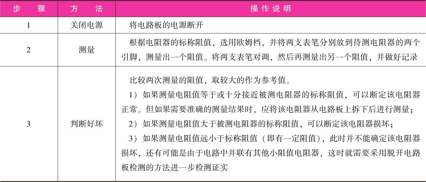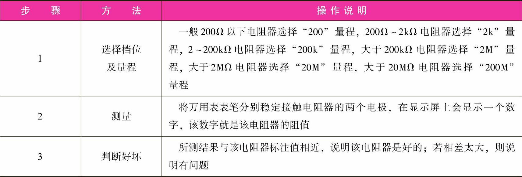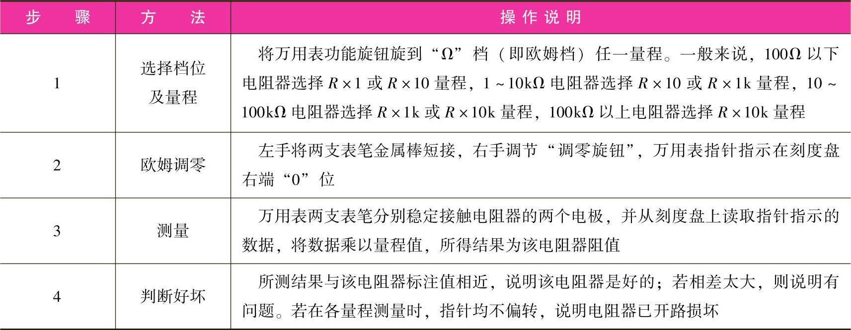表1-4 指针式万用表检测电阻器的方法及步骤