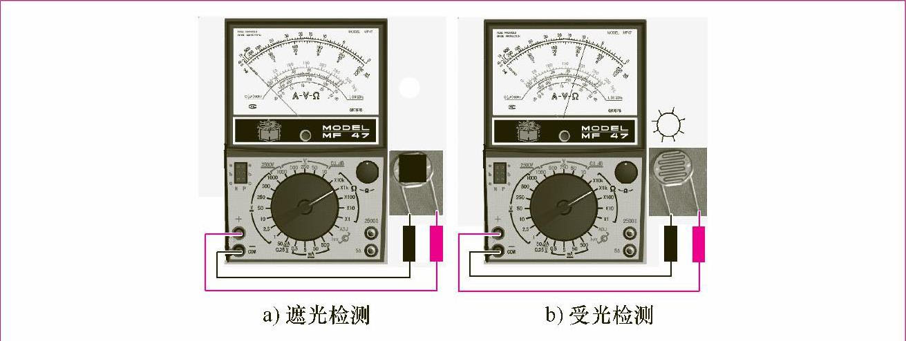 将一光源对准光敏电阻器的透光窗口,此时万用表的指针应有较大幅度的摆动,阻值明显减小。此值越小说明光敏电阻器性能越好,如图1-23b所示。若此值很大甚至无穷大,说明光敏电阻器内部开路损坏,也不能继续使用。