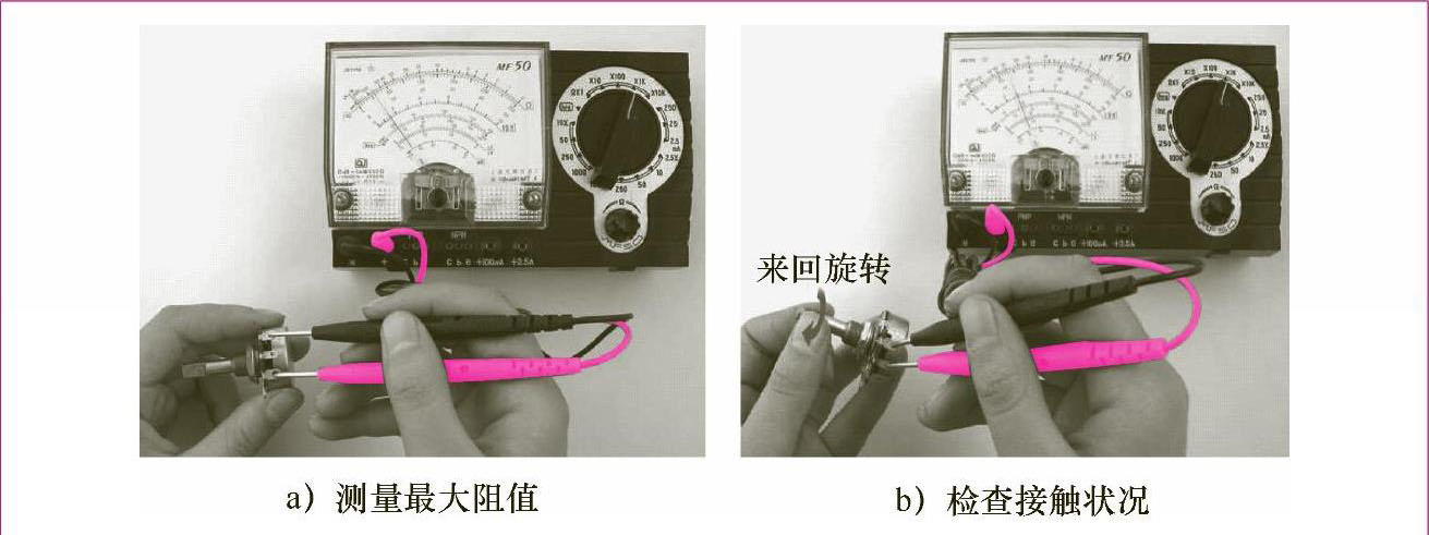 1)测量电位器的最大阻值。按照图1-22a所示,将万用表的表笔跨接在电位器的两个固定端,测量一下电位器的最大阻值,其读数应为电位器的标称阻值。如果万用表指针不动或阻值相差很多,则表明被测电位器已损坏。