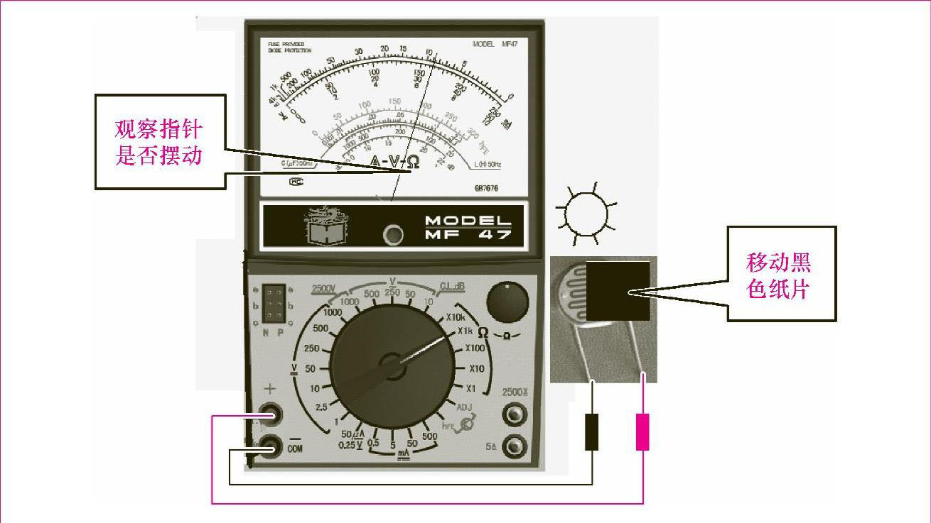 2)光敏电阻器暗阻的检测方法是,用一块黑色不透光的布完全盖严,不让光照射光敏电阻器,此时显示屏上的读数即是光敏电阻器的暗阻。