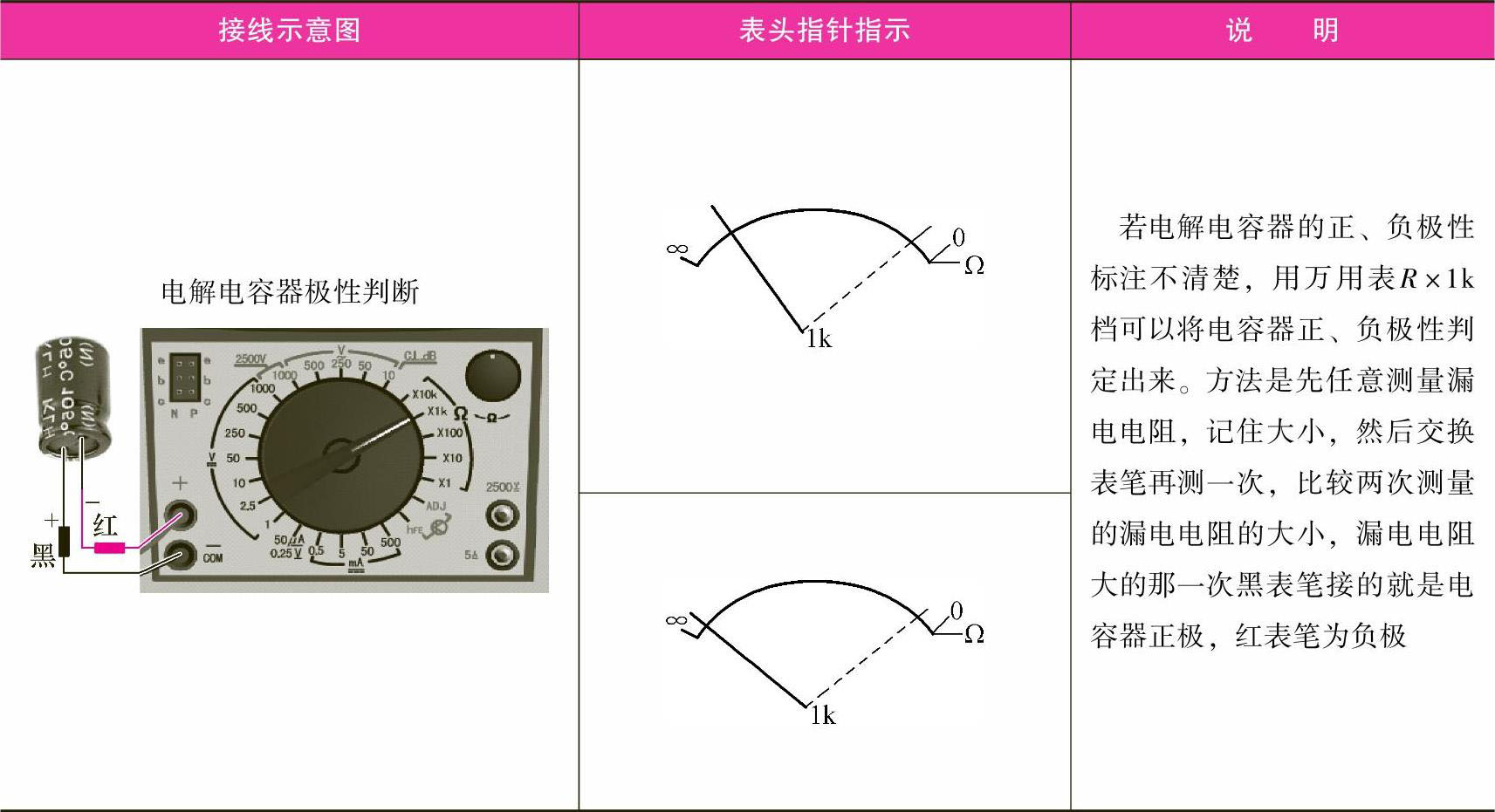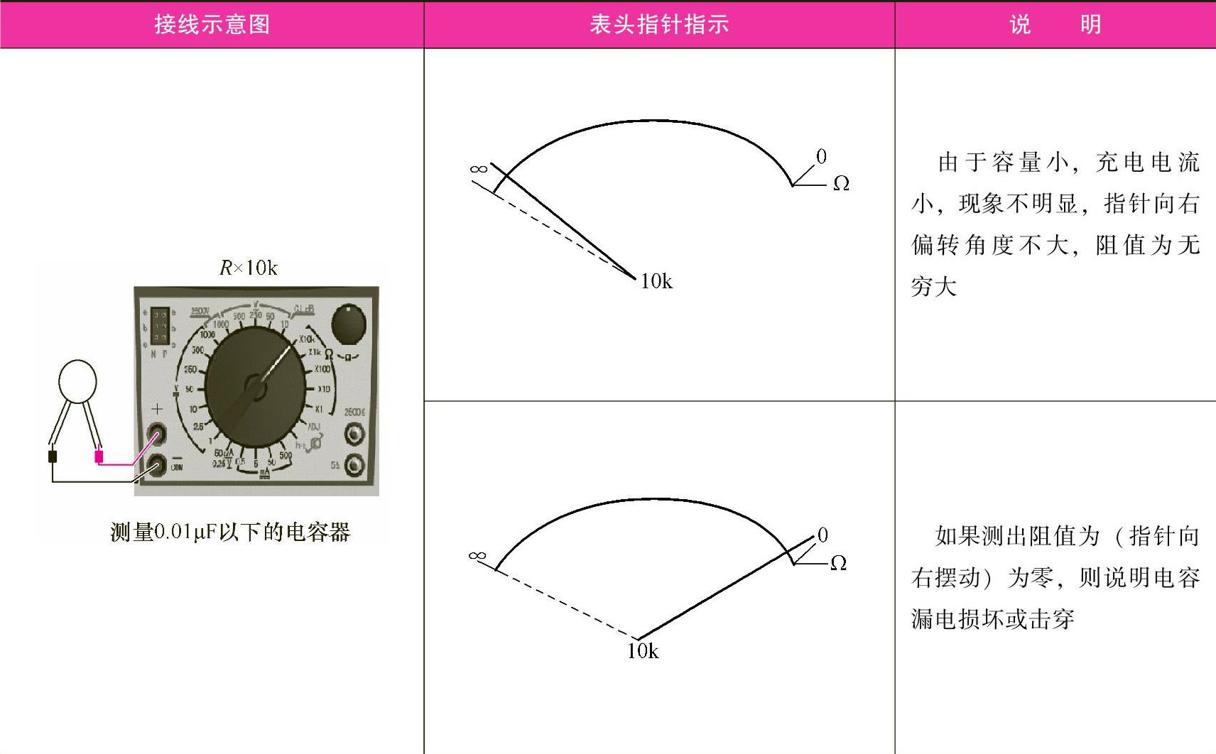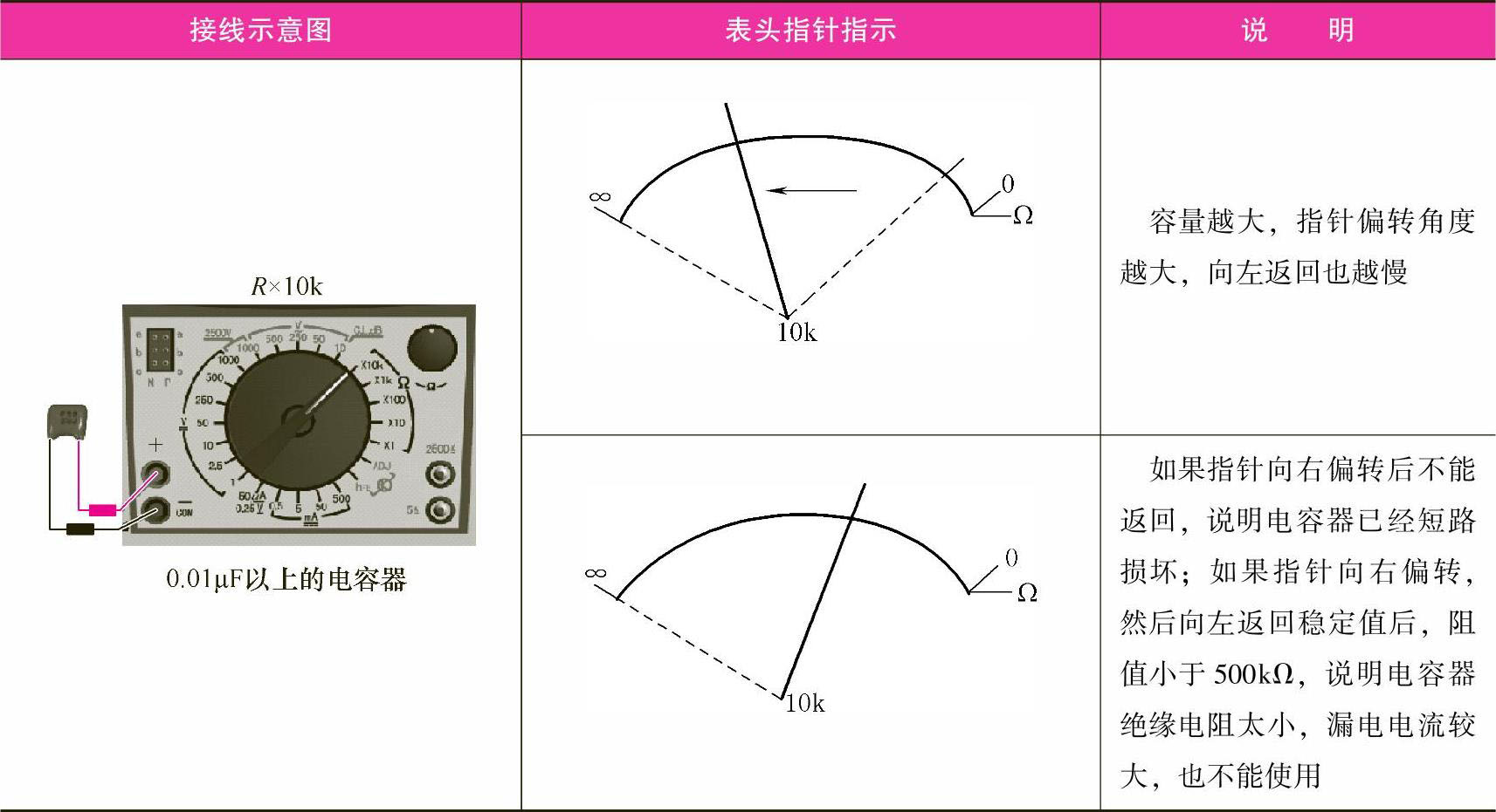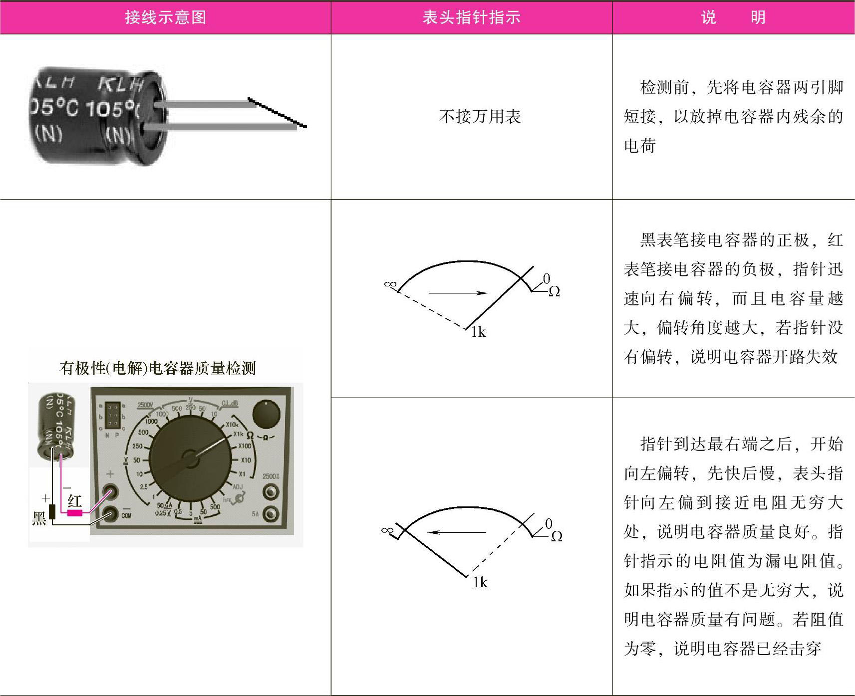用指针式万用表测量电容器的质量好坏,是电容器充放电特性的具体应用,具体检测方法见表2-5和表2-6。