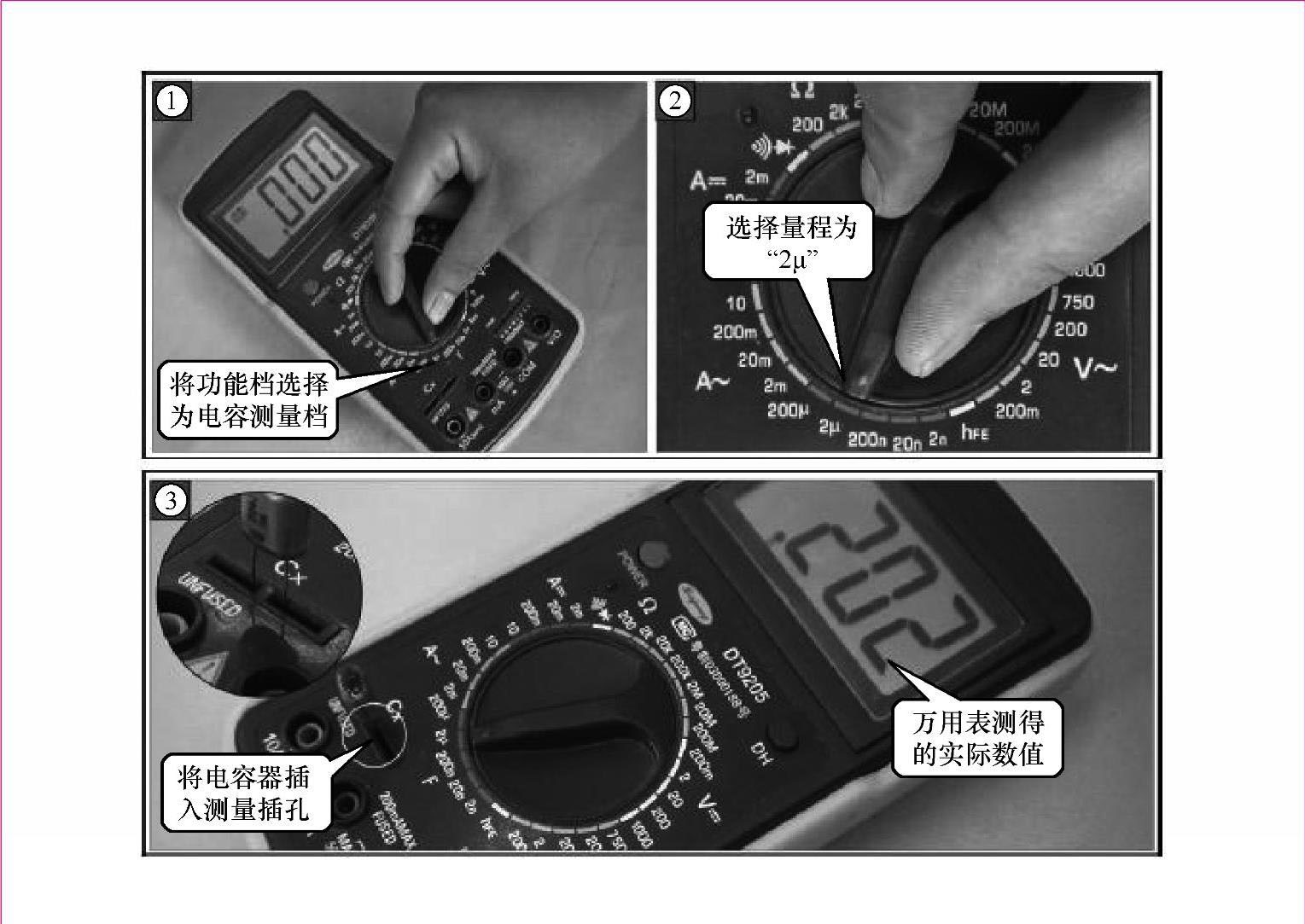 许多数字万用表都具有测量电容器的功能,其量程分为2000p、20n、200n、2μ、20μ和200μ六档。2000p档,宜于测量小于2000pF的电容器;20n档,宜于测量2000pF~20nF之间的电容器;200n档,宜于测量20~200nF之间的电容器;2μ档,宜于测量200nF~2μF之间的电容器;20μ档,宜于测量2~20μF之间的电容器;200μ档,宜于测量20~200μF之间的电容器。