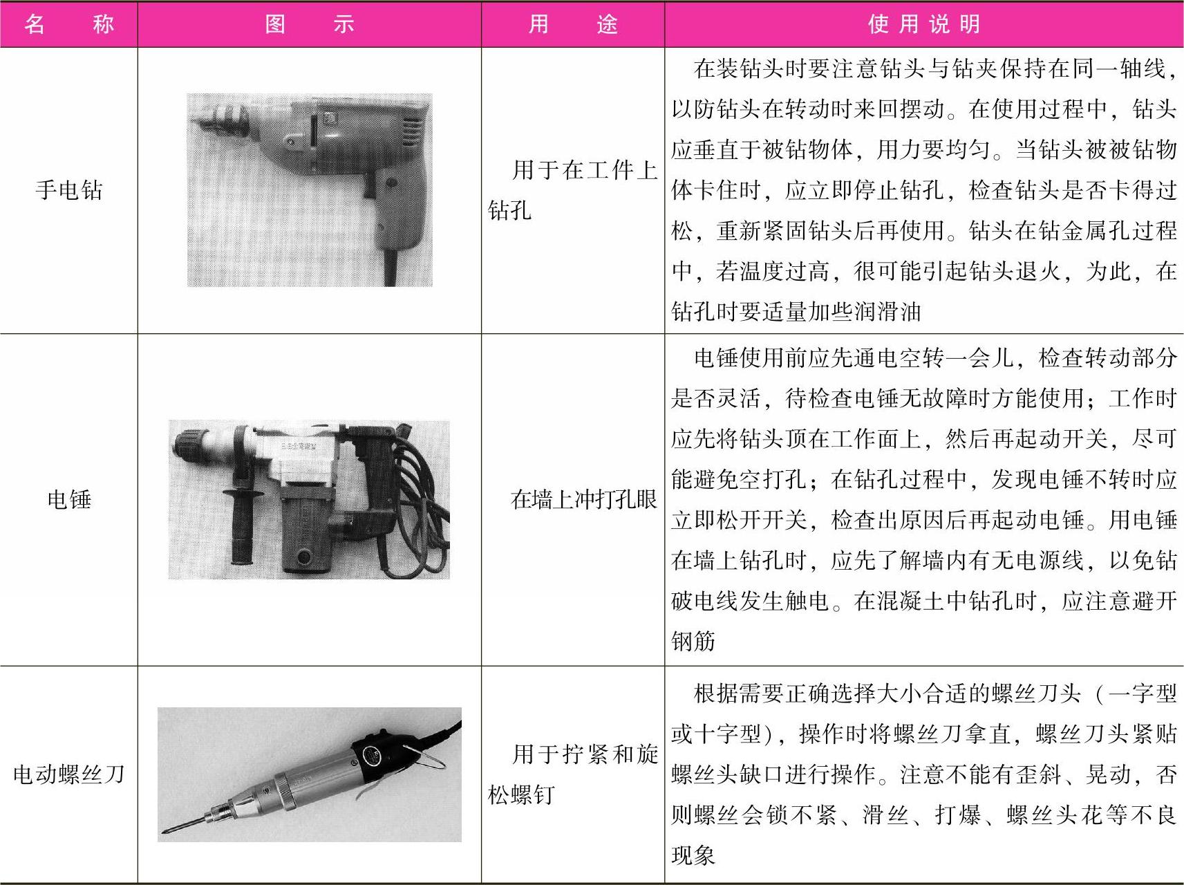 电工在从事安装作业时,常用的电动工具主要有手电钻、电锤和电动螺丝刀,其使用方法见表1-3。