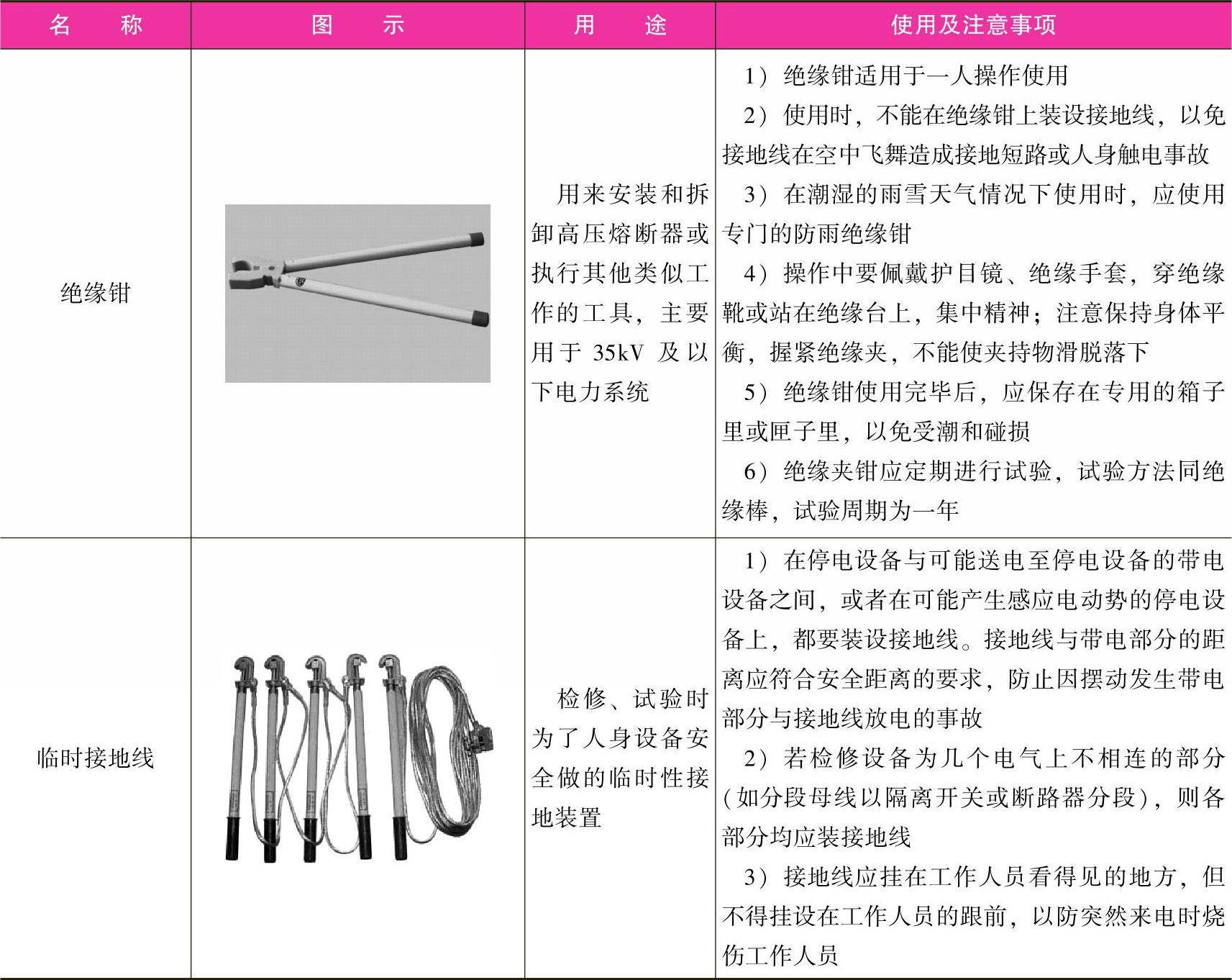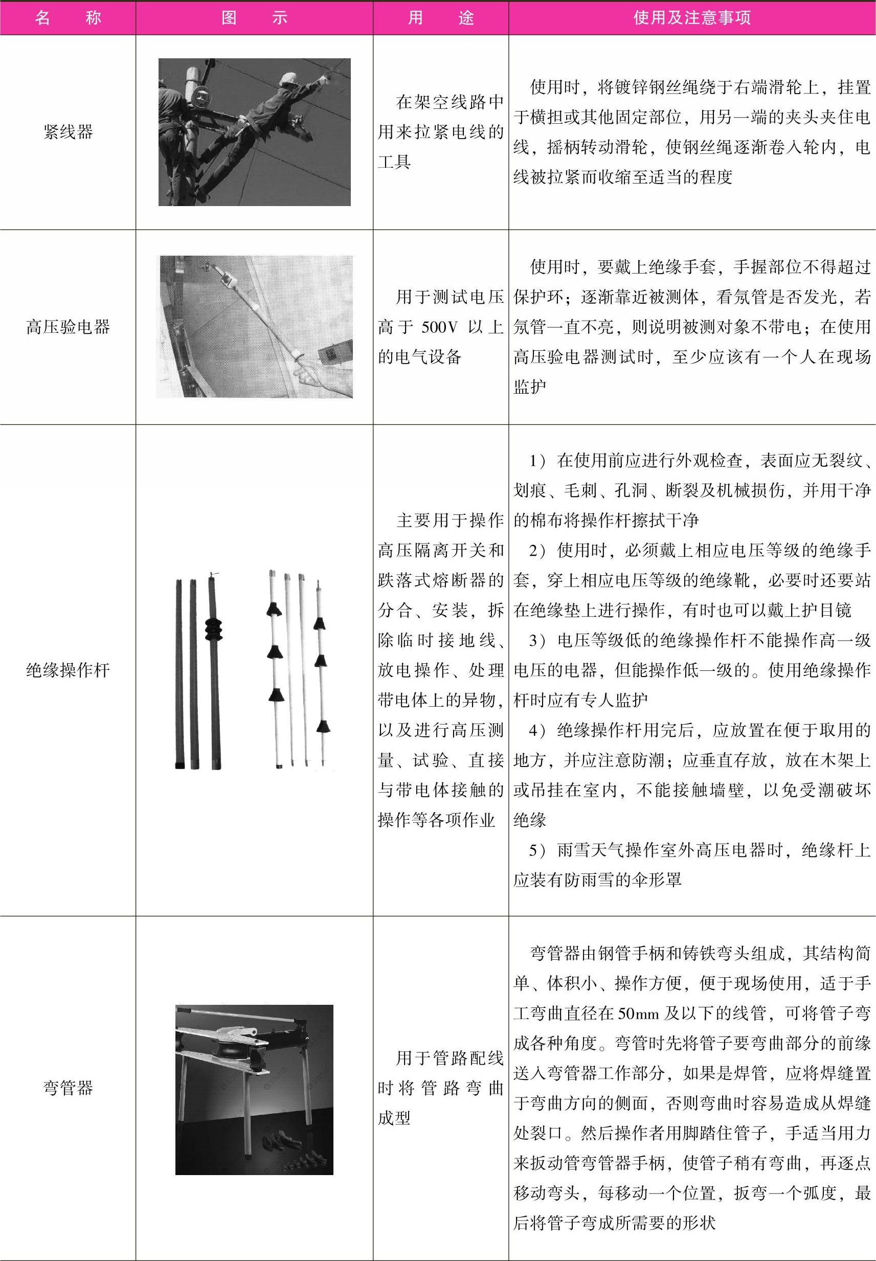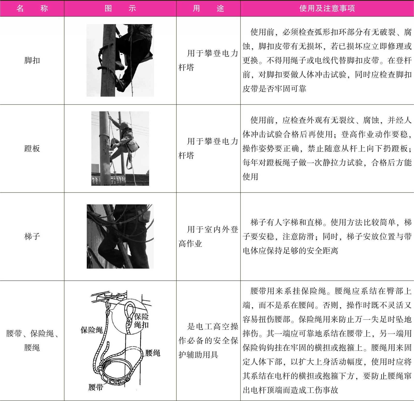 表1-4 外线电工专用工具的使用