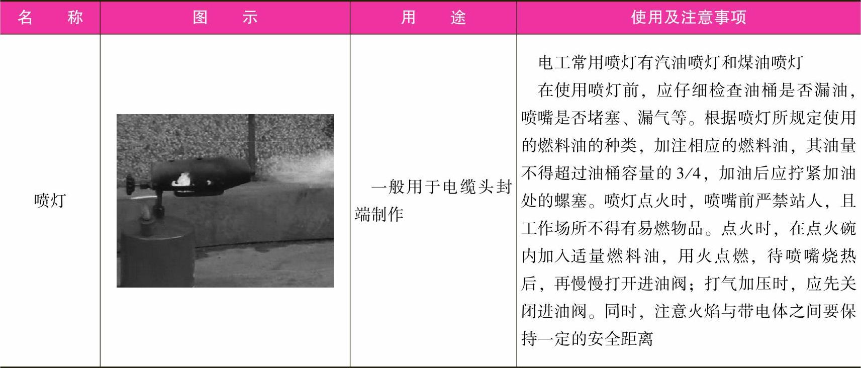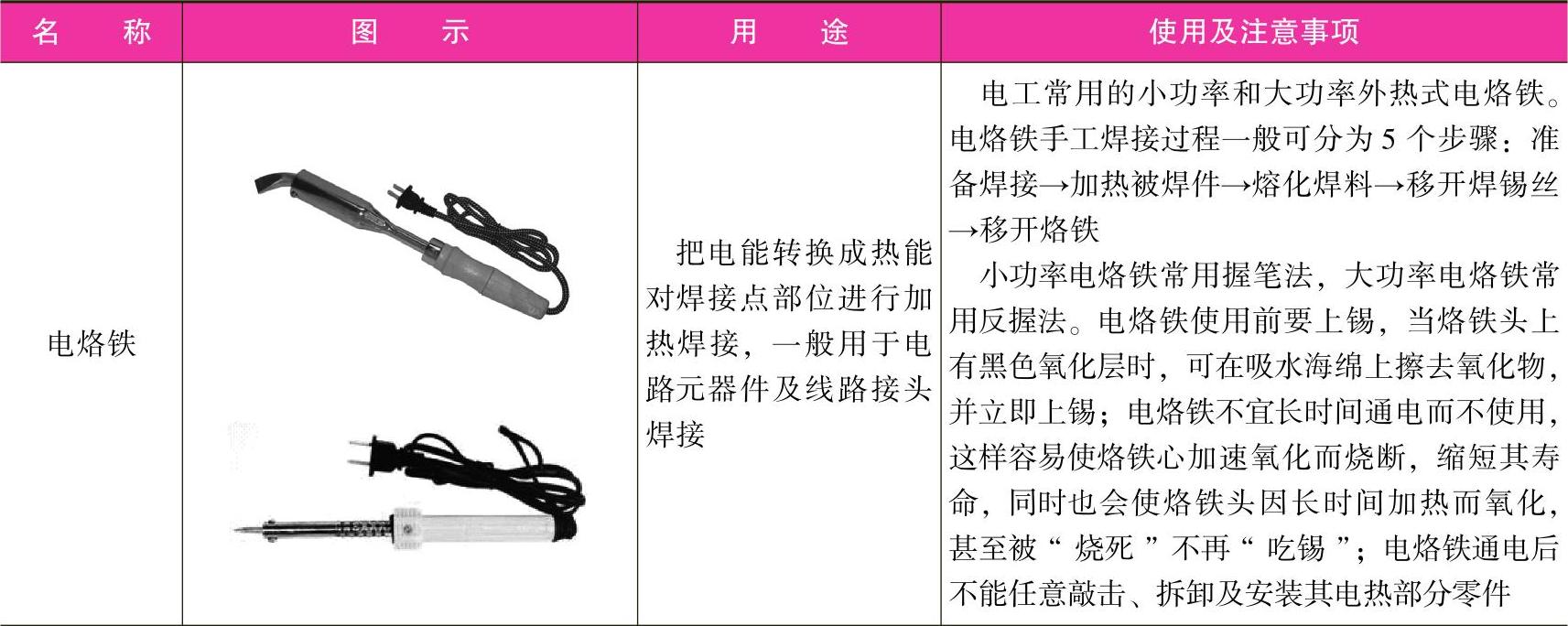 电工常用的焊接工具有电烙铁和喷灯,其使用方法及注意事项见表1-5。