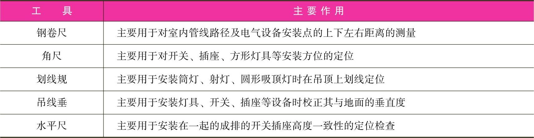 电工常用的定位测量工具有钢尺、角尺、划线规、吊线垂、水平尺等,其作用见表1-6。我们在安装电气线路、灯具、开关、插座及其他设备时,常常利用这些工具来对线路、器件或设备进行准确定位,如图1-27所示。