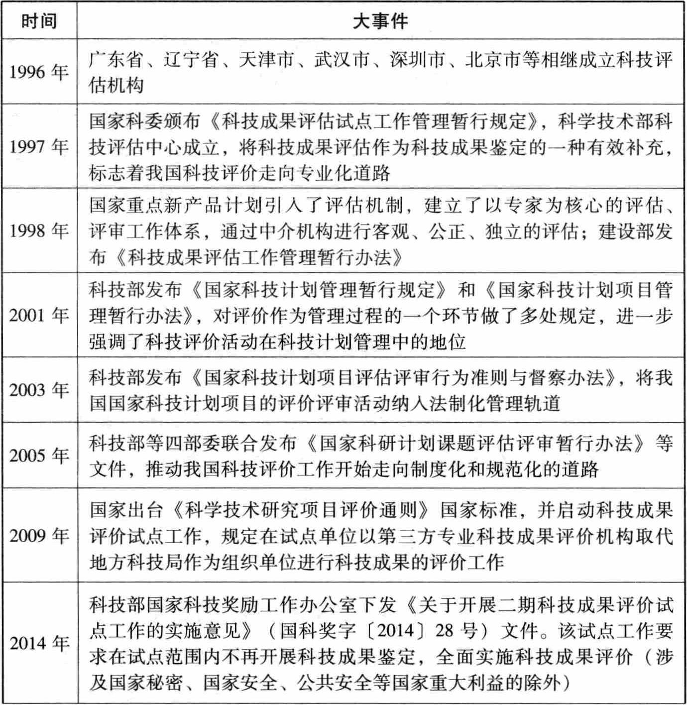总体上来讲,我国的科技评价处于不断改进与完善中。20世纪90年代初,原国家科委尝试对国家重大科技计划、项目进行科技评估。1996年,广东省、辽宁省、天津市、武汉市、深圳市、北京市等相继成立了科技评估机构。1997年12月,我国第一个国家级科技评估机构——科技部科技评估中心成立。1997年1月,国家科委颁布了《科技成果评估试点工作管理暂行规定》,将科技成果评估作为科技成果鉴定的一种有效补充。1998年,国家重点新产品计划引入了评估机制,建立了以专家为核心的评估、评审工作体系,通过中介机构进行客观、公正、独立的评估;同年,建设部发布了《科技成果评估工作管理暂行办法》。