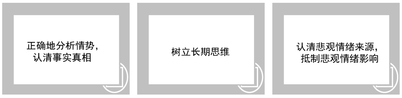 人类的天性决定了从众是不可避免的一道“魔咒”,悲观情绪又有很强的“传染性”。所以,在悲观氛围下,很多人不由自主地也会悲观。但如果我们能够做到理性一点,在悲观情绪弥漫时能够有一点定力,让自己从大环境的影响下解脱出来,认真地做一点关于形势好坏的分析,我们就会发现实际情况没有那么糟糕,事情没有那么坏。