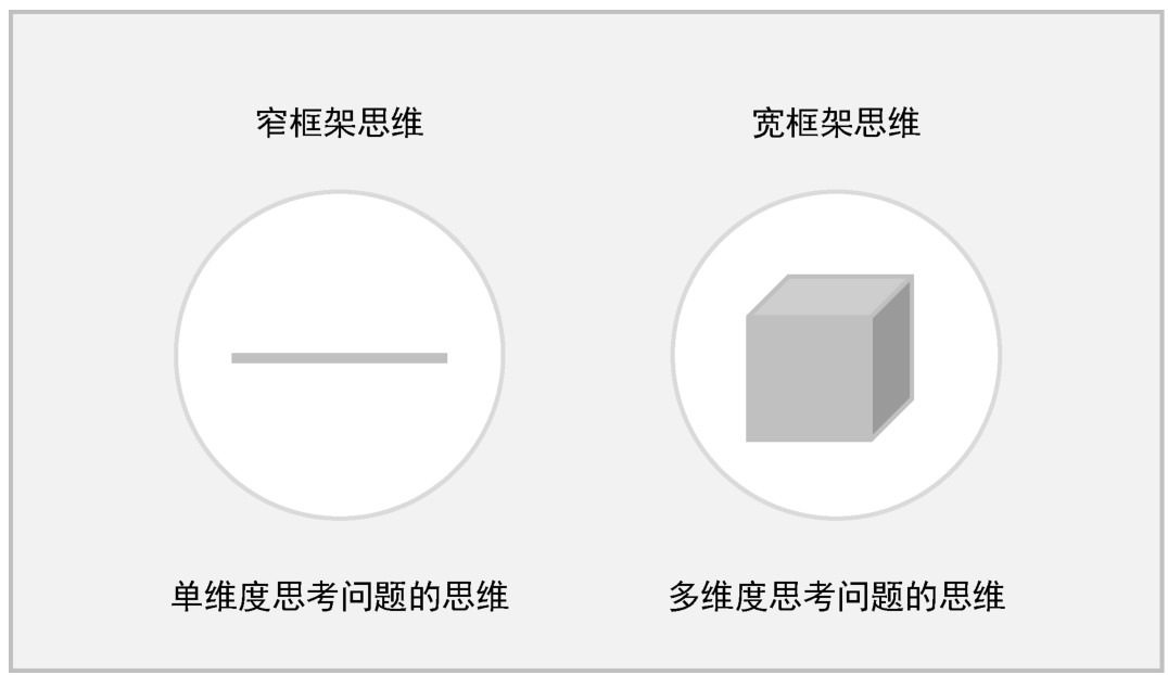 当然,这些只是问题的一方面,更大的错误在于:我只是在用“窄框架思维”思考,而不是用“宽框架思维”思考。或者说我只是基于自己的直觉思维在思考,而没有动用理性思维在思考。窄框架思维和宽框架思维如图2-4所示。