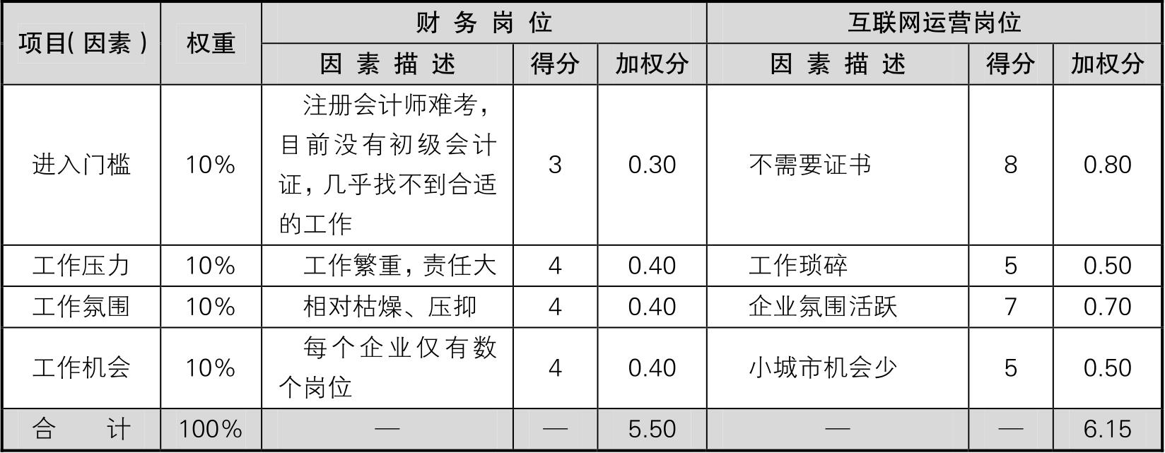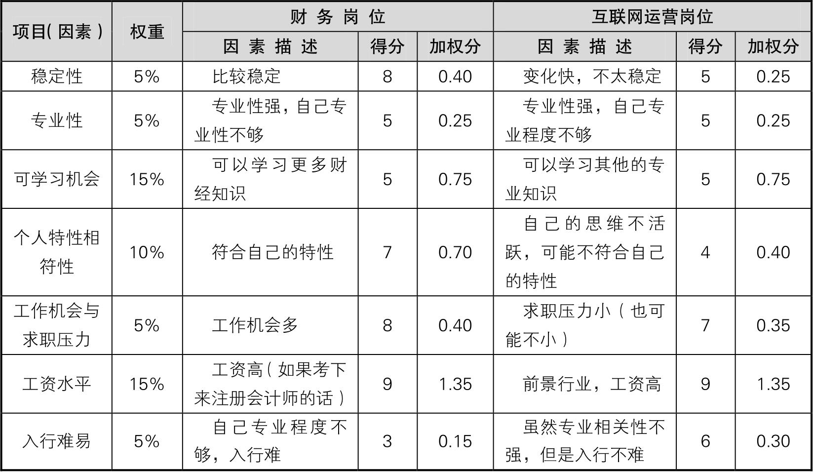 第四步要做的工作是对两个比较的选项(如财务岗位和互联网运营岗位)在各个因素(如稳定性、专业性等)上的表现估计一个得分值,并且与该因素的权重百分比相乘,这样可得到该选项(如财务岗位)在特定因素(如稳定性)上的加权分,然后把该选项在所有因素上的加权分相加,便得到两个选项各自的加权分,对两个选项的加权总分进行比较即可做出选择,如表2-7所示。