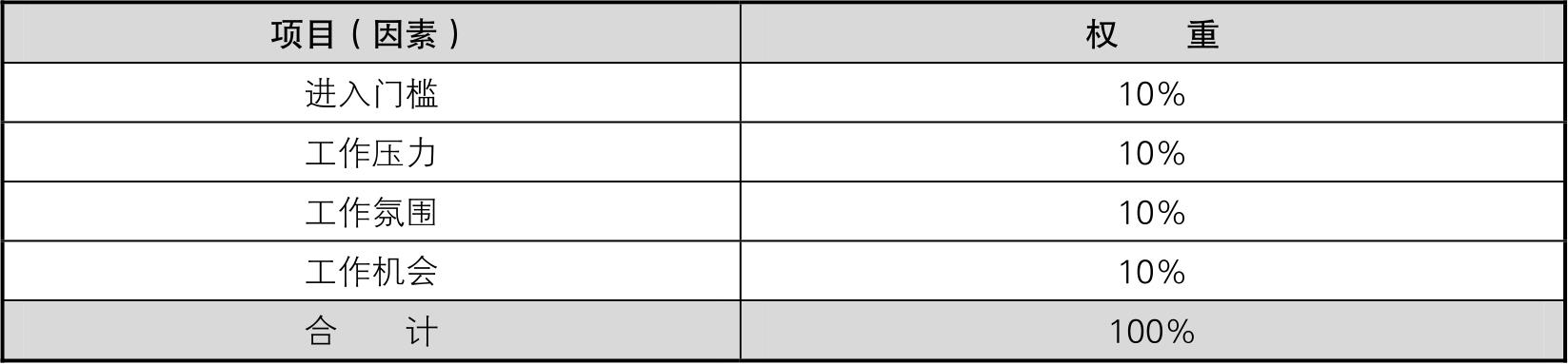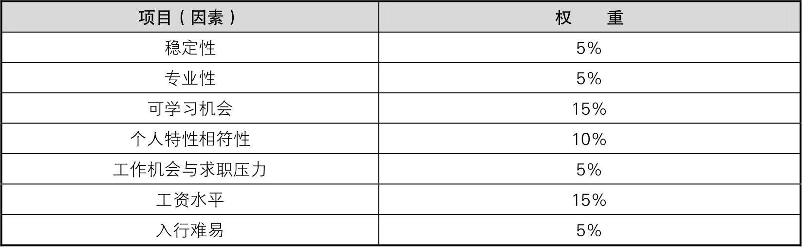 例如,你认为一份工作的稳定性对自己来说并不是最重要的,可以赋予一个较低的权重百分比,如5%;相反,工资水平在你看来是比较重要的,那就赋予一个较高的权重百分比,如15%。表2-6是我赋予各个因素的权重百分比。