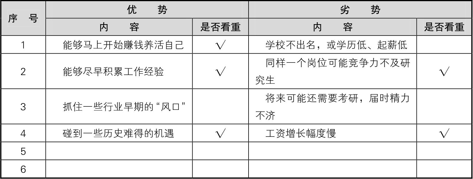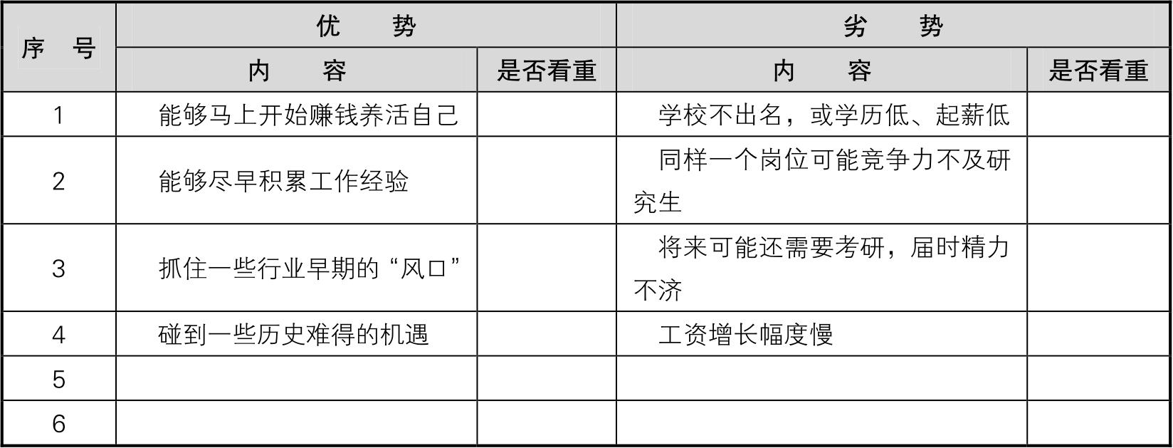 参照表2-1,画出“是否要尽快参加工作”的优劣势表格。