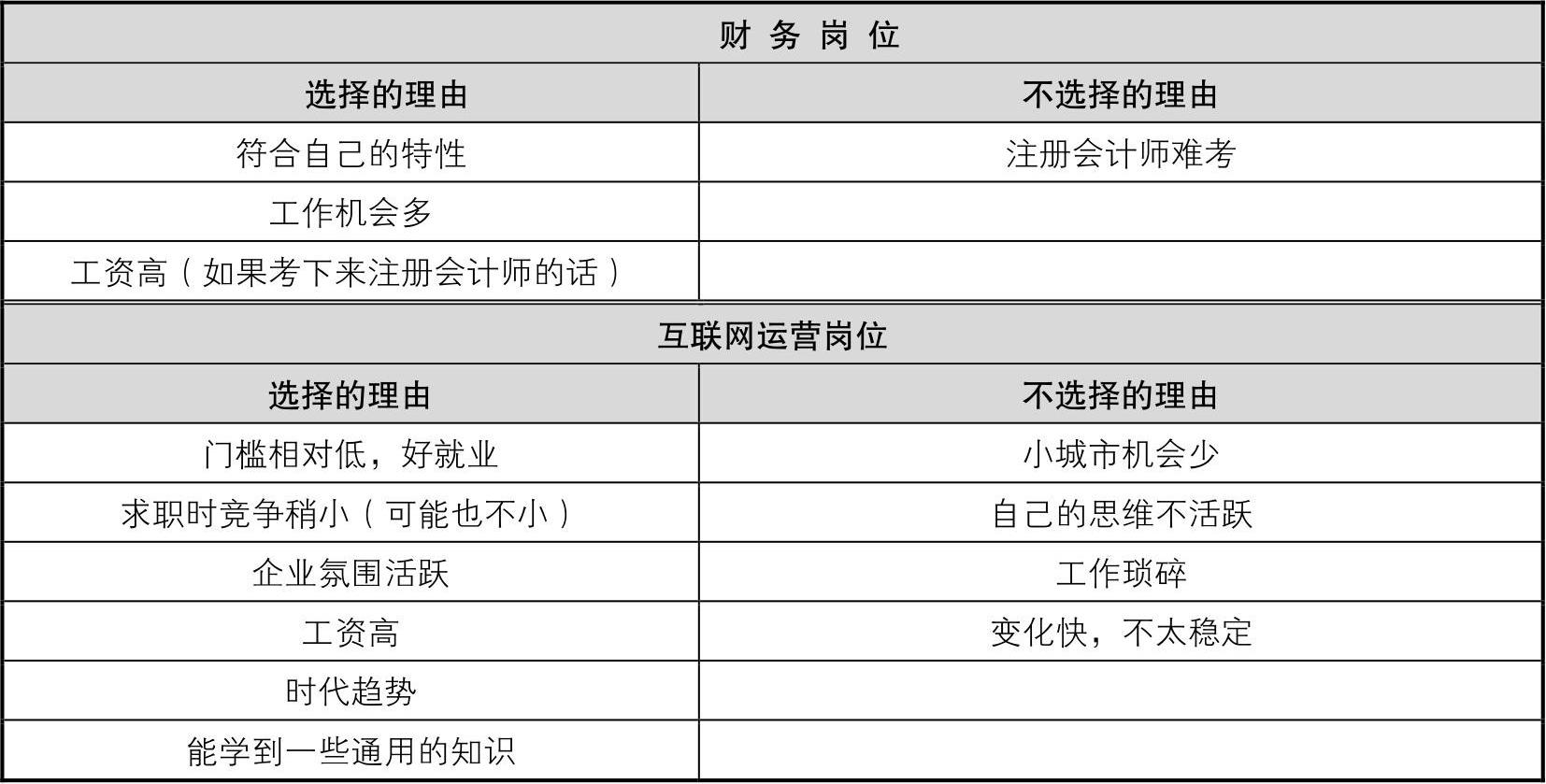 具体到那位同学的问题就是要问:财务岗位的工作是什么?它是怎样进行的?互联网运营岗位的工作是什么?它是怎样进行的?为什么会是这样?