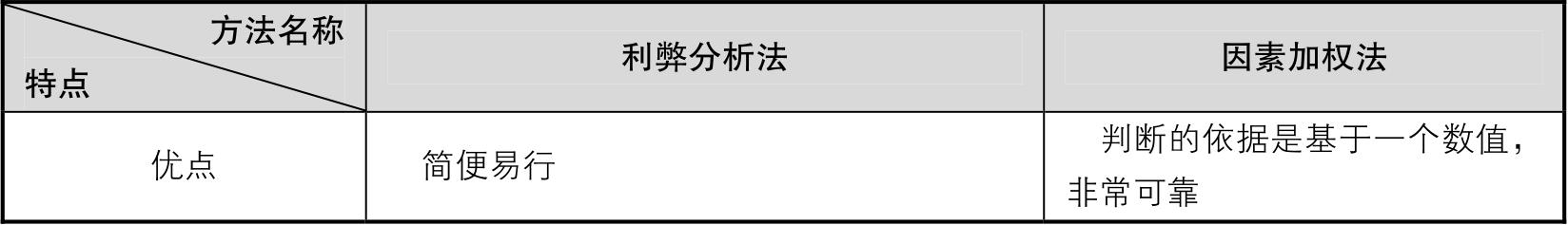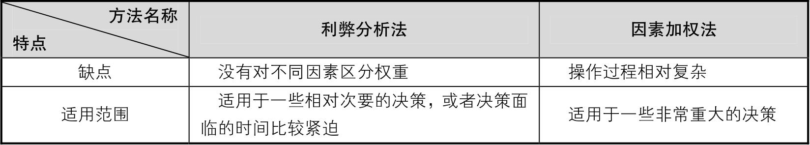 表2-8 利弊分析法和因素加权法的优缺点和适用范围