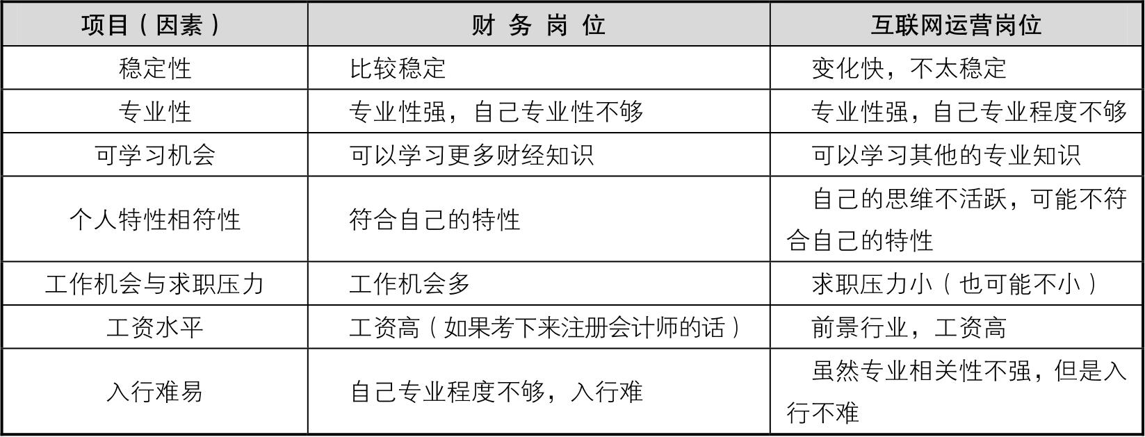 我曾接到一位大三同学的咨询,她曾尝试使用利弊分析法来解决自己的困惑——毕业后到底是选择财务岗位,还是选择互联网运营岗位。她按照这个方法操作之后,还是无法进行有效的决策。表2-4所示为这位同学列出的相关问题决策因素。