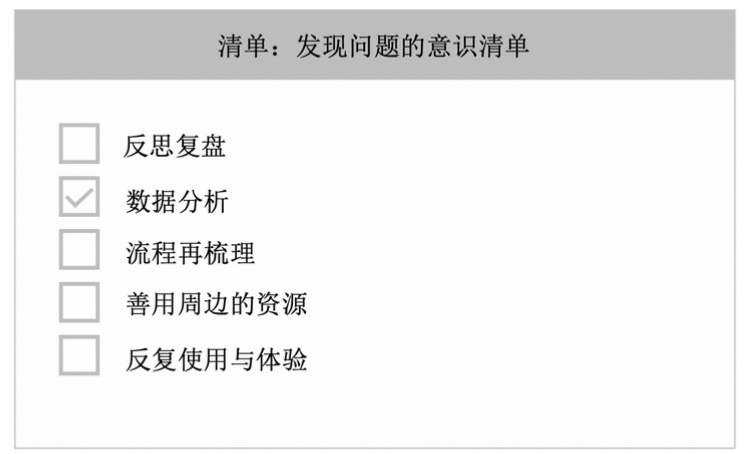 例如,在做产品工作和运营工作中,我们可以积累关于发现问题的意识清单,如图2-3所示,其中包括反思复盘、数据分析、流程再梳理、善用周边的资源、反复使用与体验等相关内容。有了这个意识清单,我们在解决工作中一些棘手的问题时就有了至少五个方向(路径),不会面对问题再无从下手。
