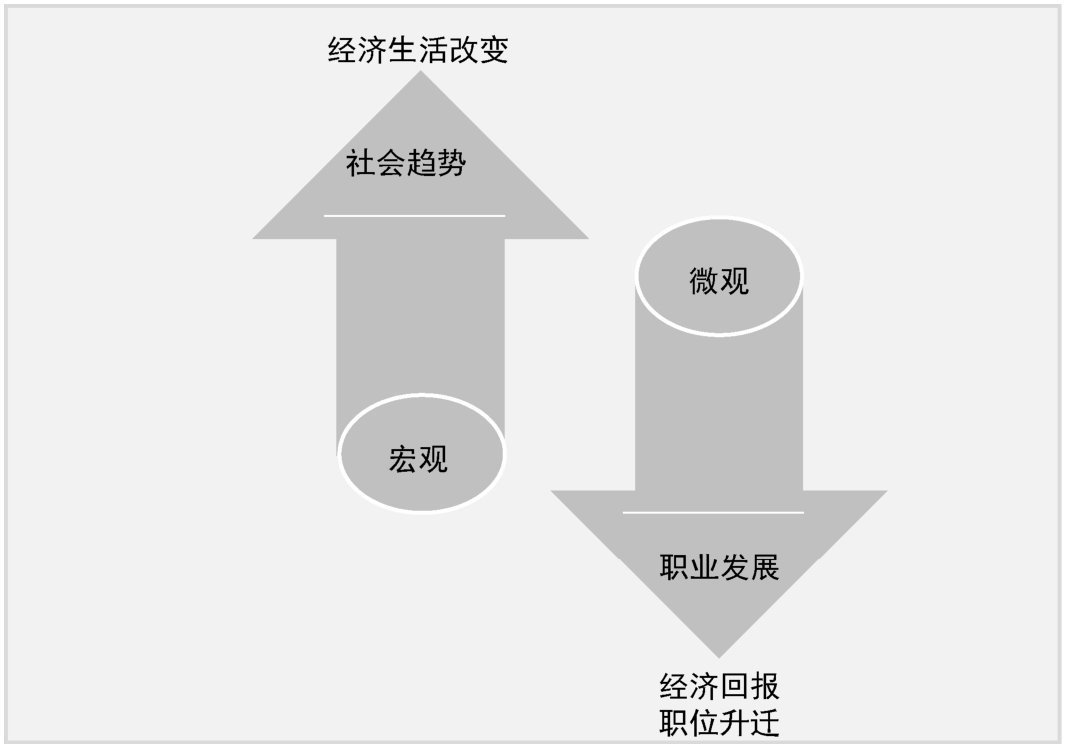 职场人在选择职业时,既要从个人的微观实际出发,又要考虑互联网的整体宏观趋势。从微观上看,一个职场人选择进入互联网行业或企业,往往能够获得比较高的经济回报,职位升迁也会更容易。从宏观上看,互联网给社会生活的方方面面带来了巨大的改变,并将持续改变社会经济生活。互联网对于个人求职的宏观与微观影响,如图1-1所示。个人的职业选择应该顺势而为,而不是逆势而行。
