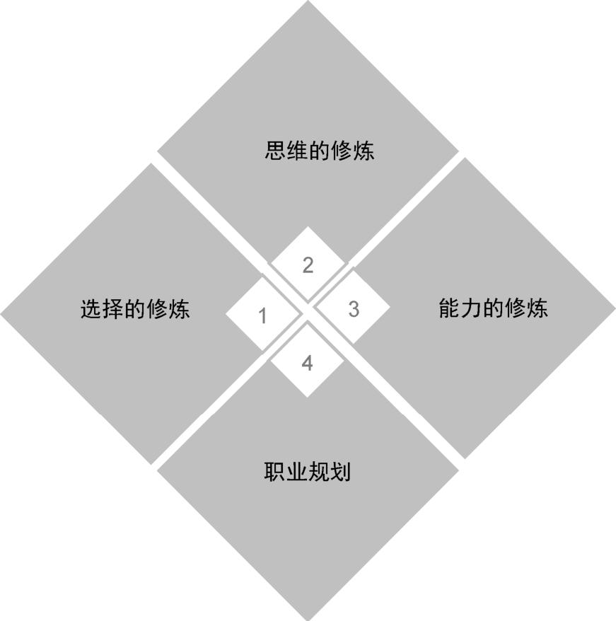 每个职场人都期望在职业生涯中平步青云,每一个高速发展、充满机遇的行业又是竞争最激烈的行业,在激烈竞争的行业中脱颖而出是一件有挑战性的事情。互联网行业就是这样,这是一个充满朝气的行业,是一个充满无限可能的行业,也是一个竞争异常激烈的行业。无论是一名职场新手进入互联网行业,还是其他行业的人中途转型到互联网行业,要在激烈的竞争中胜出,不是一件容易的事情。这不仅要求一个人拥有很强的个人能力、逻辑思维、十足的勤奋,还需要较好的运气和机遇。运气和机遇是无法把控的因素,但个人能力的提高、思维的养成是职场人可以付诸行动的。本节从可以把控的确定性因素——选择、思维、能力、职业规划四个方面入手,来剖析一个人如何才能成为优秀的互联网职场人,为求职者的职场之路提供一些思路。优秀互联网职场人的四项修炼如图1-4所示。