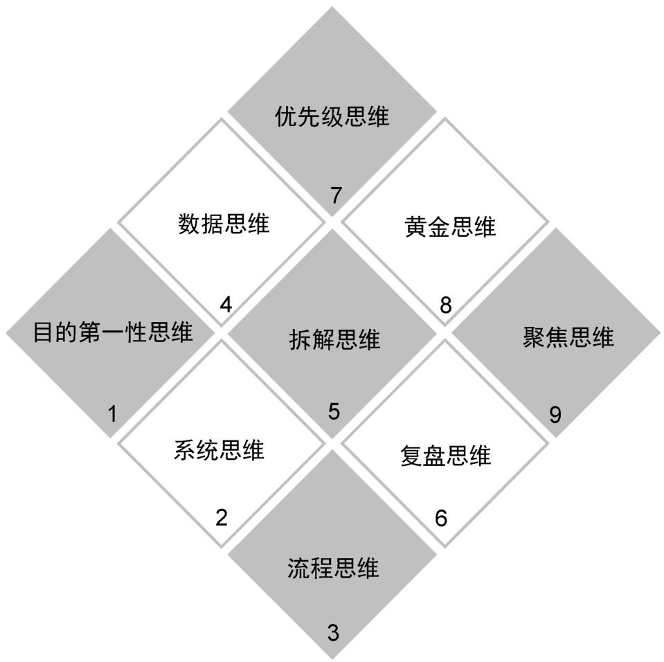 对于初入互联网职场的人来说,至少有一些必修的思维工具可以帮助自己达成上述目的,如图1-6所示。这些思维工具对于职场人各有不同的价值,能够应用在不同的场景中解决不同的问题。