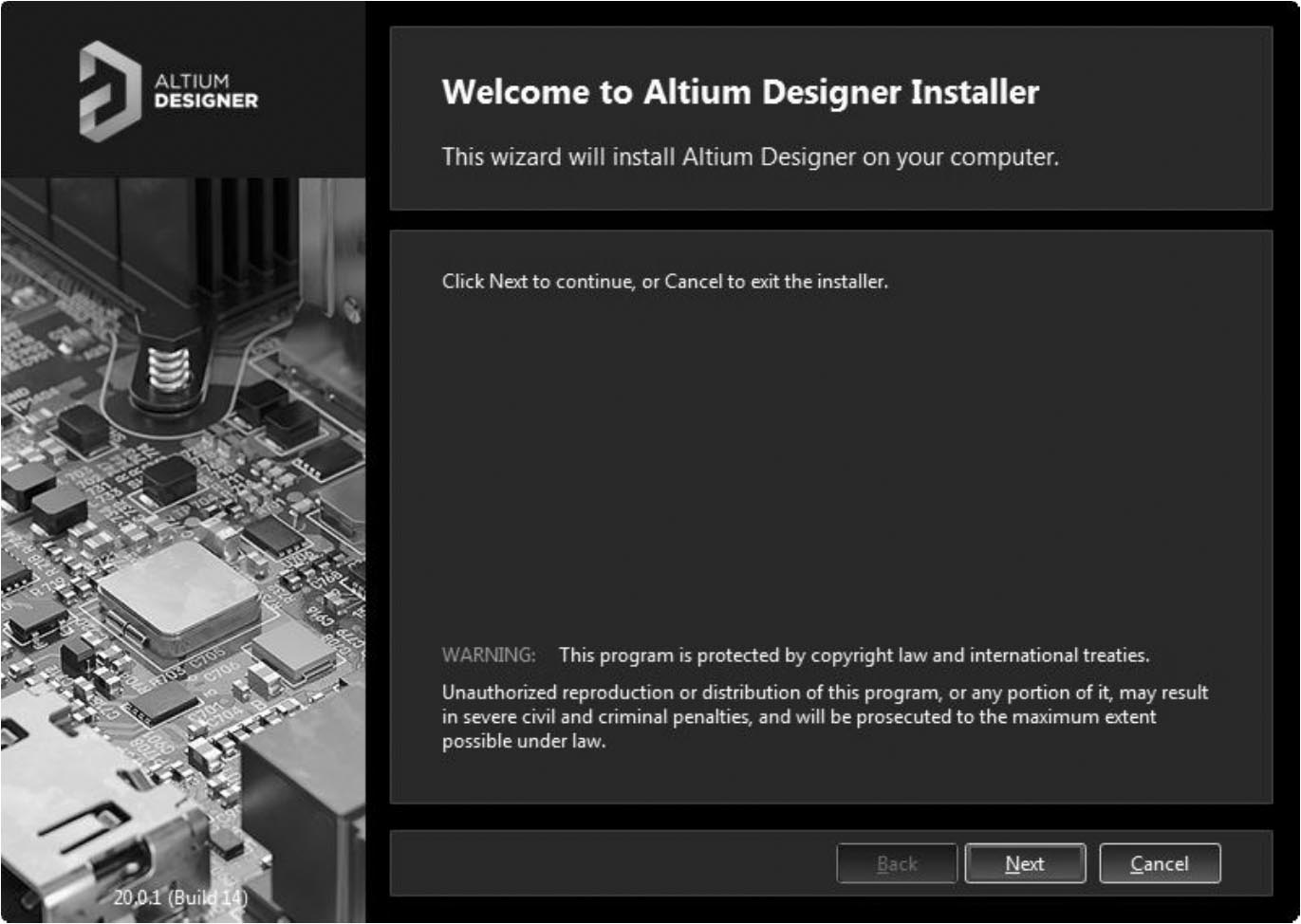 第1步:从网上将Altium Designer 20的安装包下载至本地计算机,在本地计算机中将其解压,找到并双击“AltiumDesigner20Setup.exe”,弹出Altium Designer 20的安装界面,如图1-1所示。