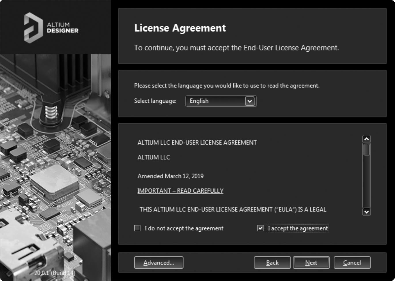 第2步:单击“Next”按钮,弹出Altium Designer 20的安装协议对话框,这里不需要选择语言,勾选I accept the agreement选项即可,如图1-2所示。