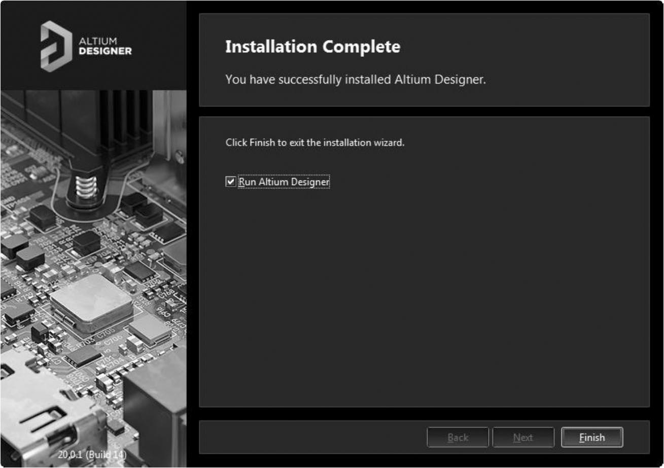 第6步:安装结束后,弹出安装完成对话框,如图1-7所示。单击“Finish”按钮即可完成Altium Designer 20的安装。在安装过程中,可以随时单击“Cancel”按钮终止安装过程。